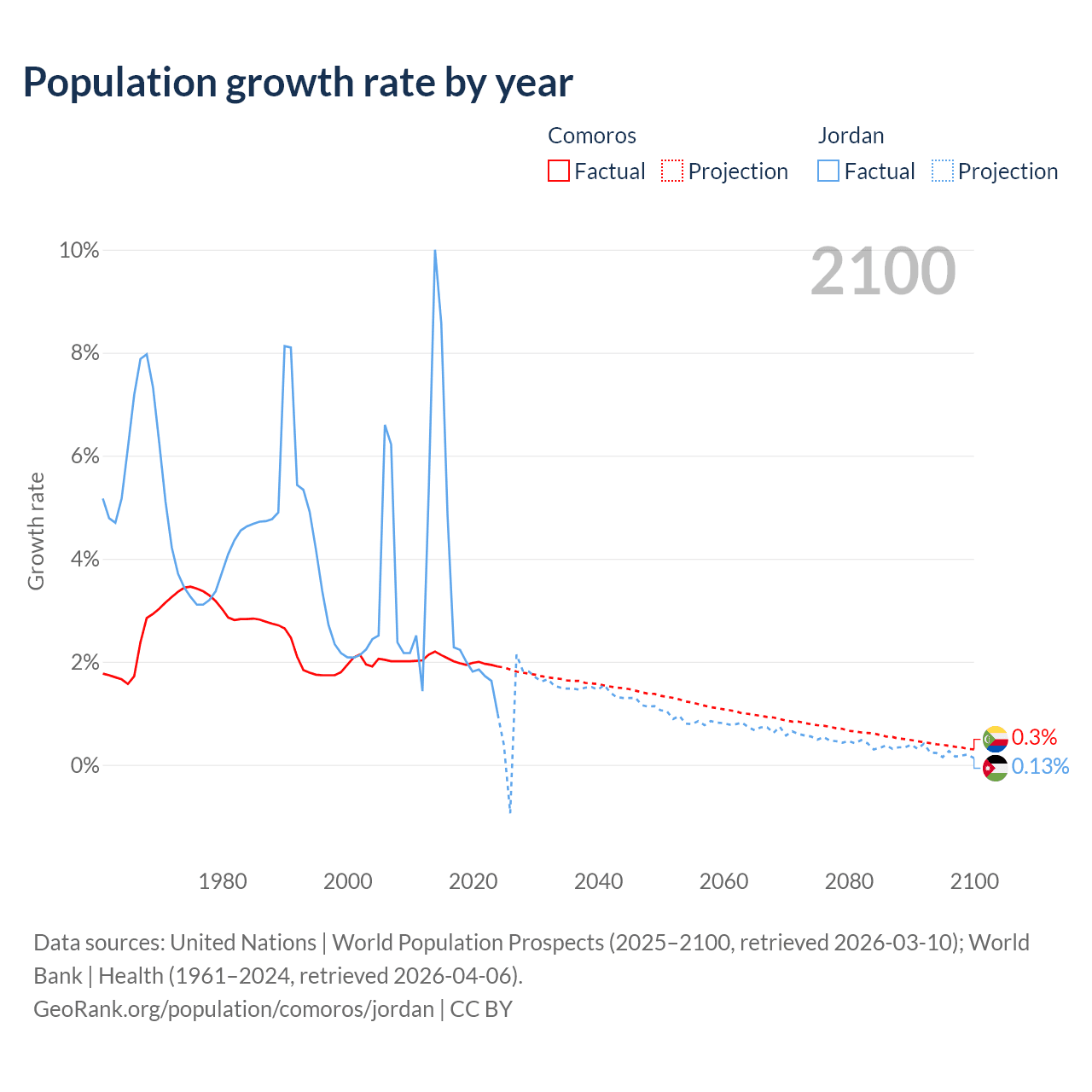 - For the last 10 years, Comoros has had an average growth rate of +2.01% per year vs +3.45% in Jordan.