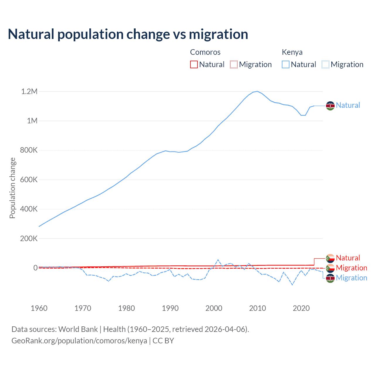 Over the last 10 years, 87.9% of the population change in Comoros is from natural causes (a gain of 179,319 people) and 12.1% is from migration (a loss of 24,709 people). In Kenya 95.3% is from natural causes (a gain of 10,892,362 people) and 4.67% is from migration (a loss of 533,876 people).
