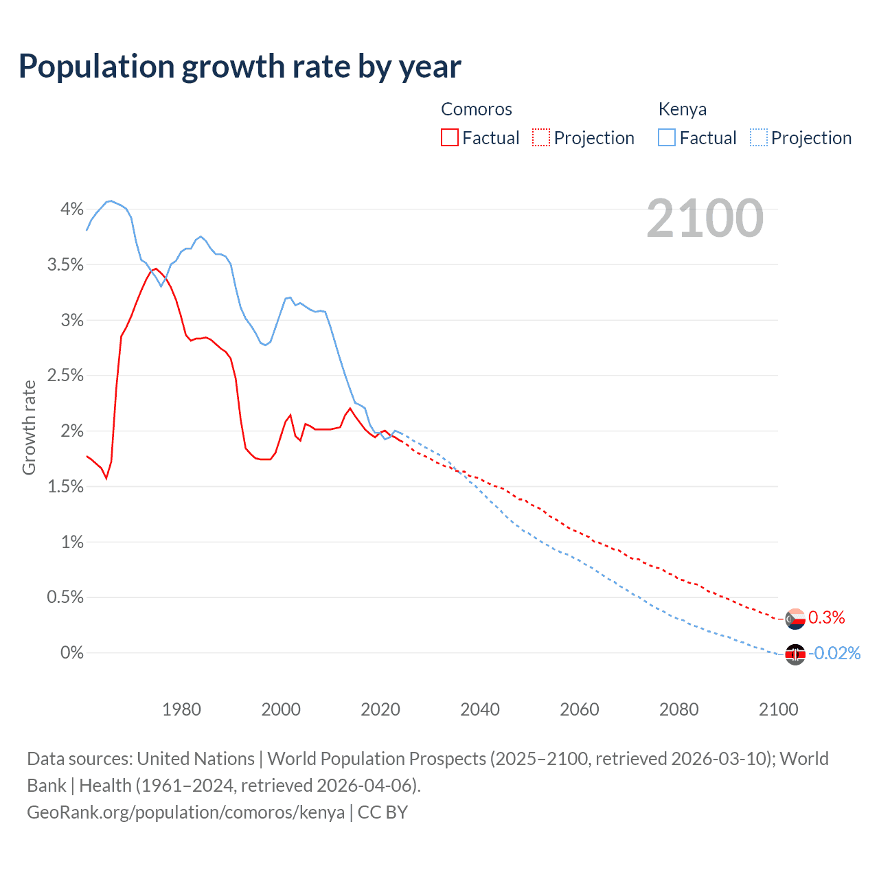 - For the last 10 years, Comoros has had an average growth rate of +2.01% per year vs +2.08% in Kenya.
