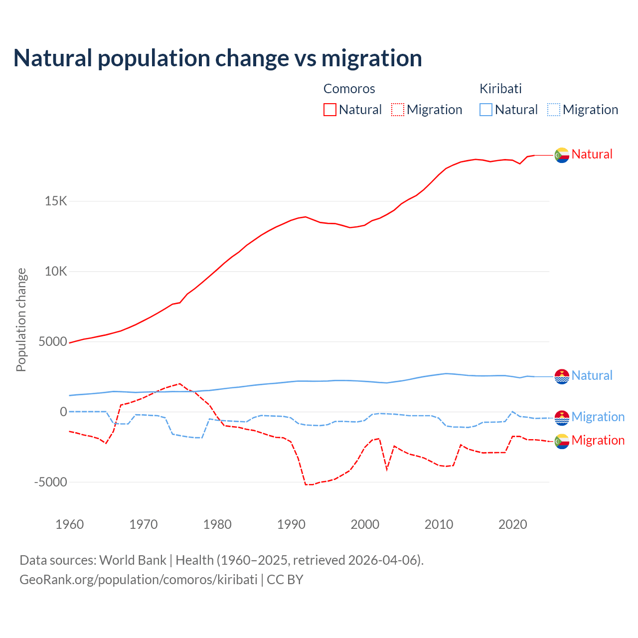 Over the last 10 years, 87.9% of the population change in Comoros is from natural causes (a gain of 179,319 people) and 12.1% is from migration (a loss of 24,709 people). In Kiribati 80% is from natural causes (a gain of 25,262 people) and 20% is from migration (a loss of 6,330 people).