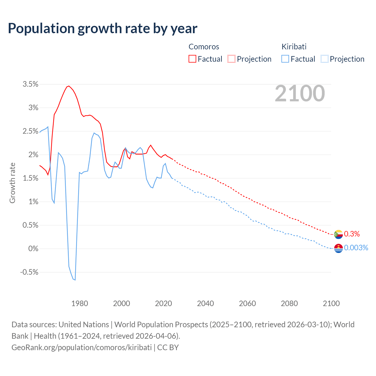 - For the last 10 years, Comoros has had an average growth rate of +2.01% per year vs +1.53% in Kiribati.