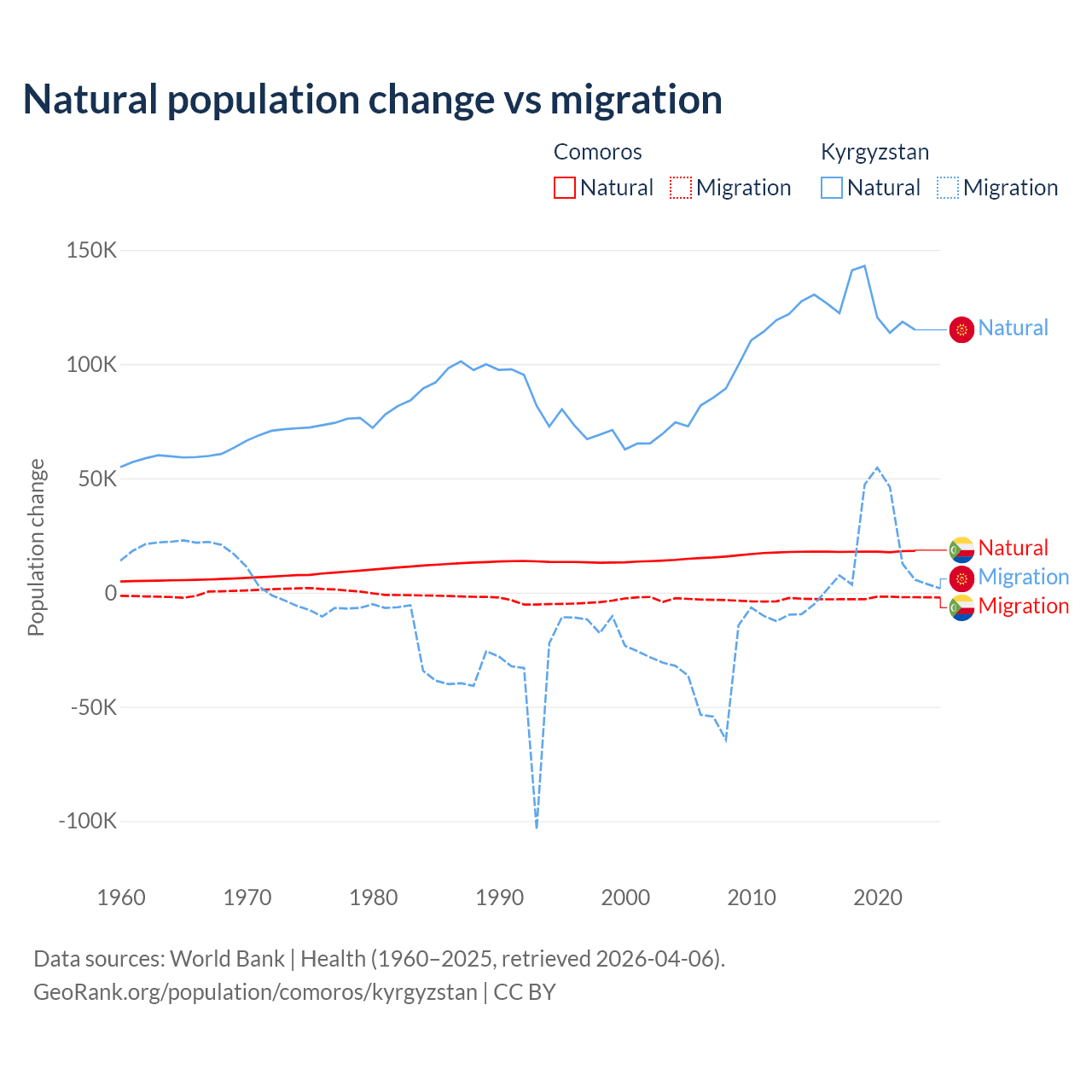 Over the last 10 years, 87.9% of the population change in Comoros is from natural causes (a gain of 179,319 people) and 12.1% is from migration (a loss of 24,709 people). In Kyrgyzstan 88.5% is from natural causes (a gain of 1,258,837 people) and 11.5% is from migration (a gain of 164,132 people).