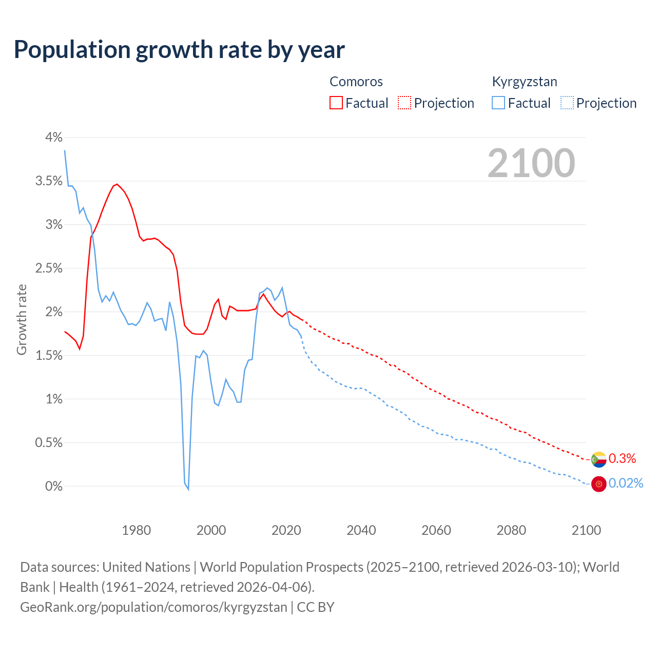 - For the last 10 years, Comoros has had an average growth rate of +2.01% per year vs +2.05% in Kyrgyzstan.