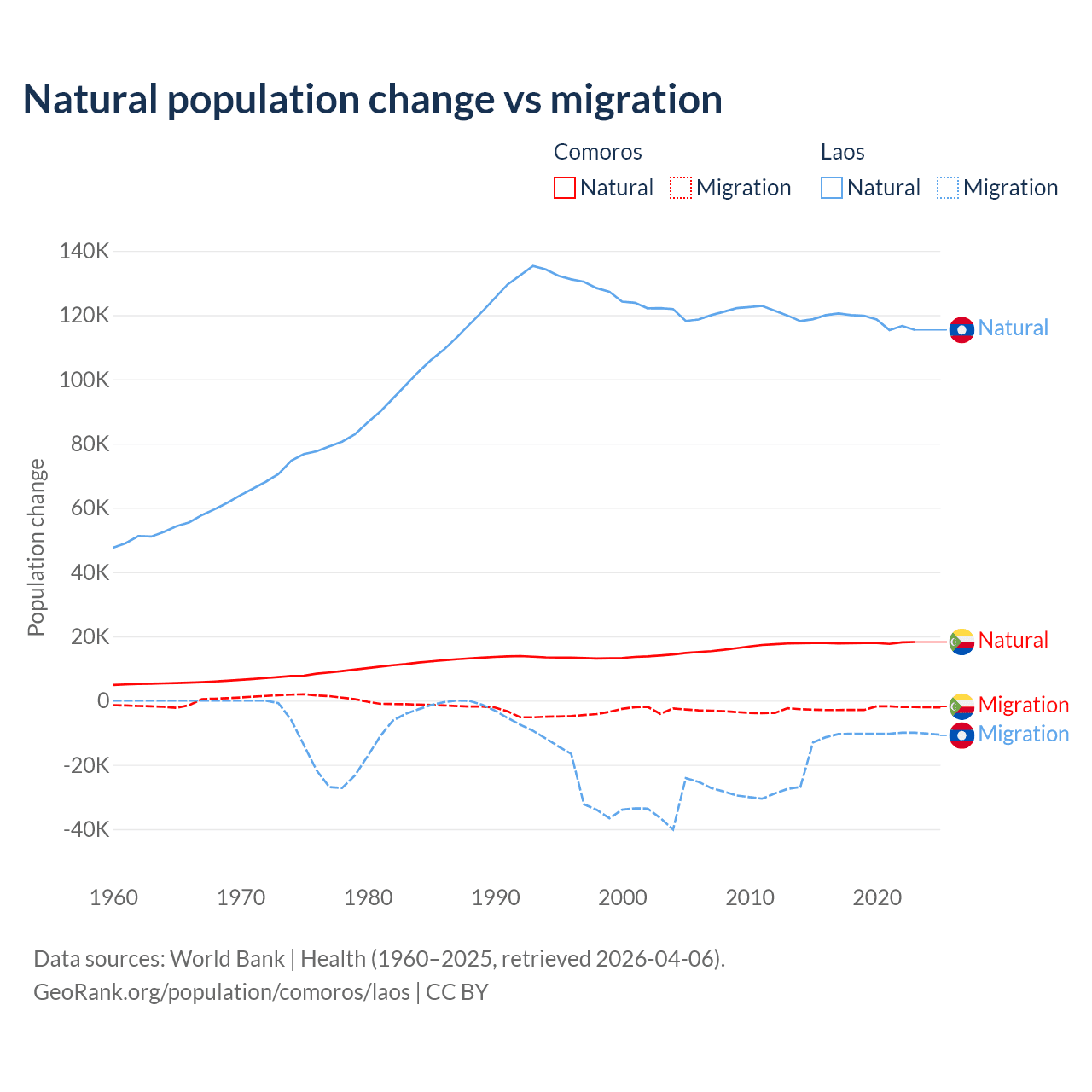 Over the last 10 years, 87.9% of the population change in Comoros is from natural causes (a gain of 179,319 people) and 12.1% is from migration (a loss of 24,709 people). In Laos 90.6% is from natural causes (a gain of 1,183,013 people) and 9.41% is from migration (a loss of 122,899 people).