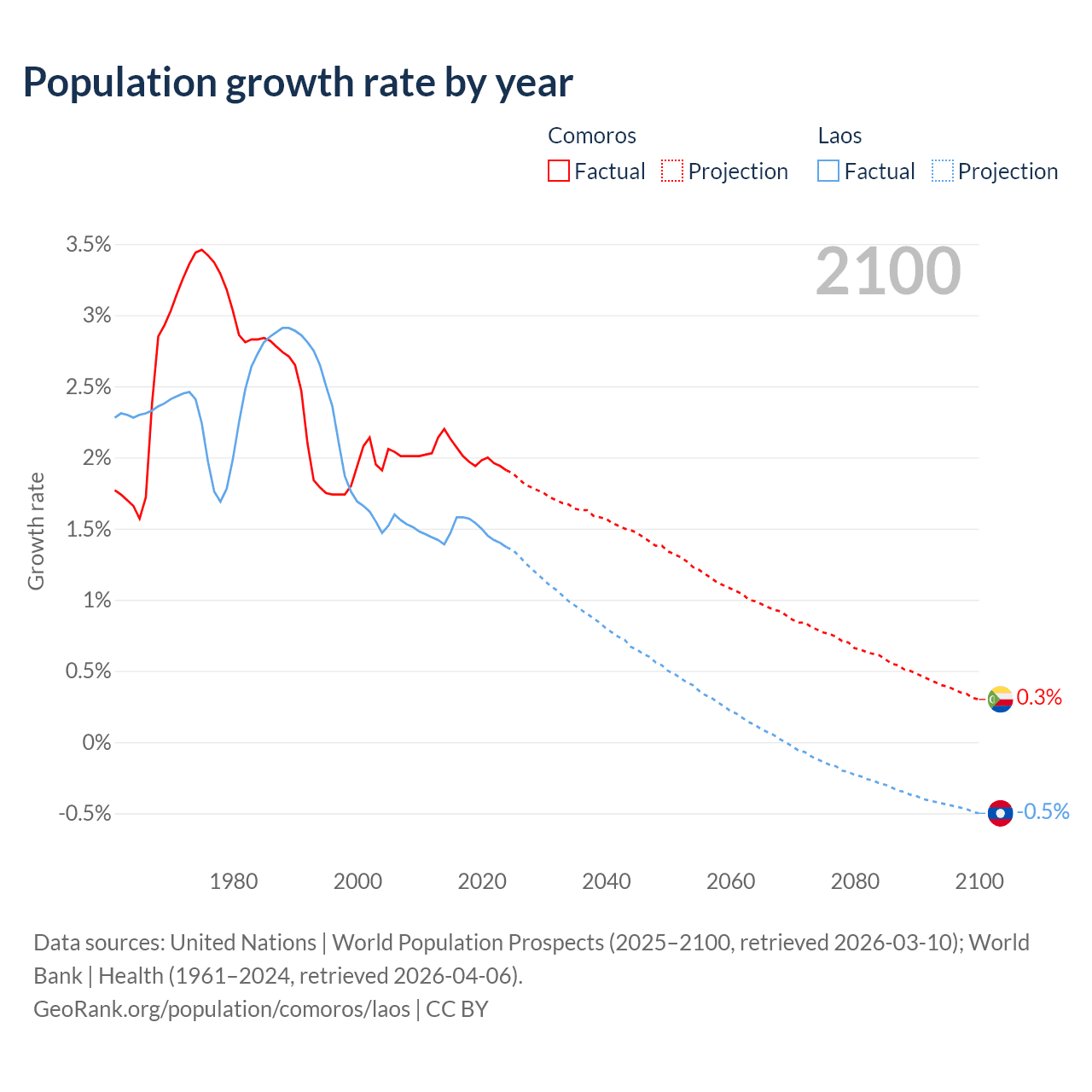 - For the last 10 years, Comoros has had an average growth rate of +2.01% per year vs +1.48% in Laos.