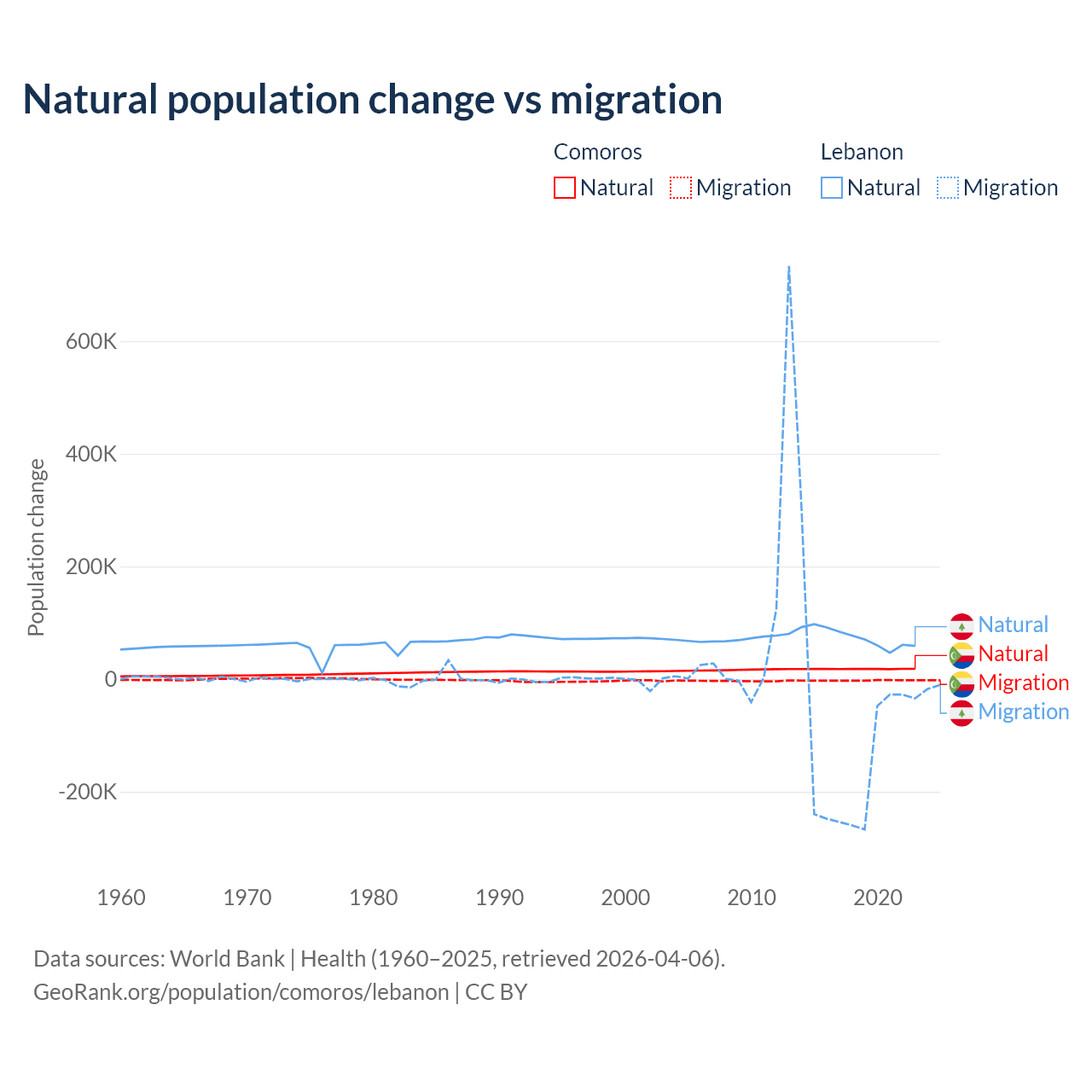 Over the last 10 years, 87.9% of the population change in Comoros is from natural causes (a gain of 179,319 people) and 12.1% is from migration (a loss of 24,709 people). In Lebanon 40.1% is from natural causes (a gain of 739,256 people) and 59.9% is from migration (a loss of 1,103,772 people).