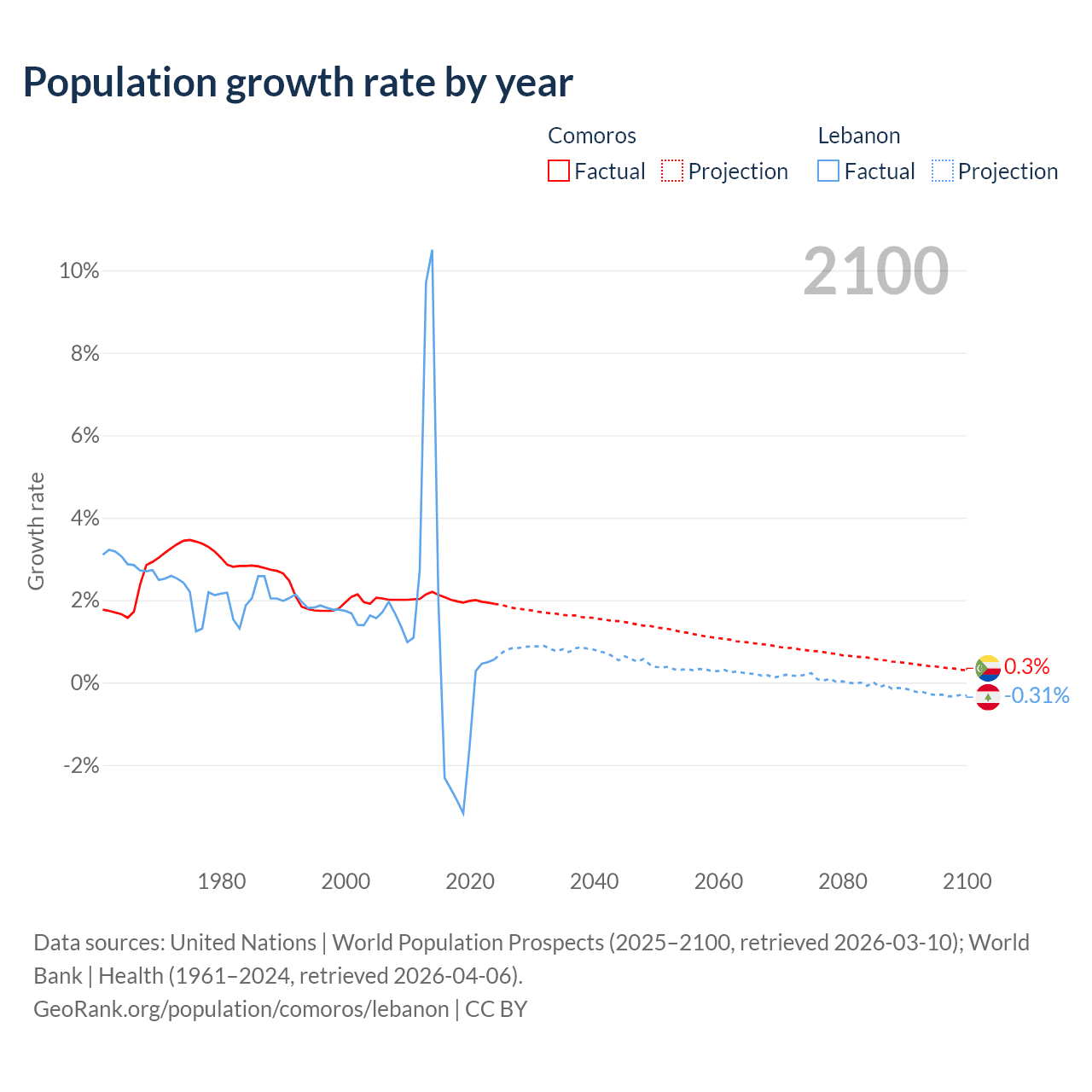 - For the last 10 years, Comoros has had an average growth rate of +2.01% per year vs +0.16% in Lebanon.