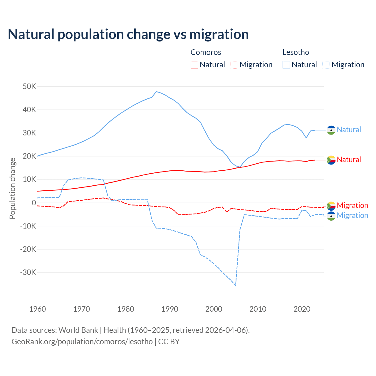 Over the last 10 years, 87.9% of the population change in Comoros is from natural causes (a gain of 179,319 people) and 12.1% is from migration (a loss of 24,709 people). In Lesotho 84.2% is from natural causes (a gain of 315,836 people) and 15.8% is from migration (a loss of 59,457 people).