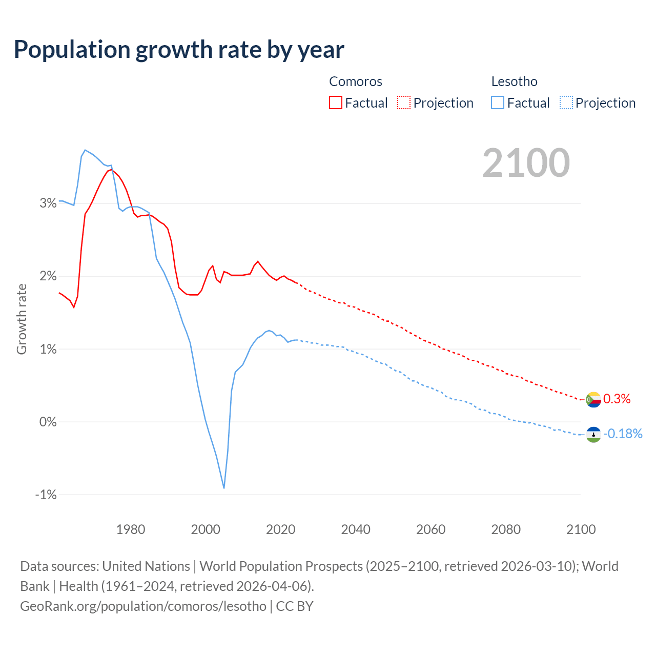 - For the last 10 years, Comoros has had an average growth rate of +2.01% per year vs +1.17% in Lesotho.