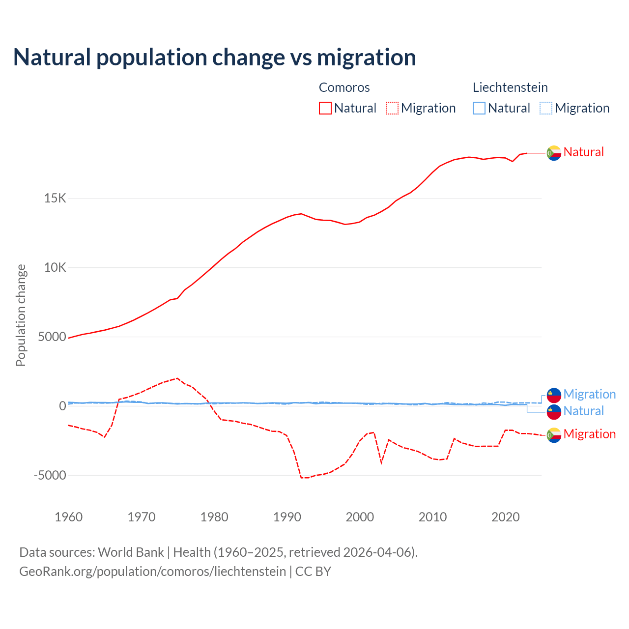 Over the last 10 years, 87.9% of the population change in Comoros is from natural causes (a gain of 179,319 people) and 12.1% is from migration (a loss of 24,709 people). In Liechtenstein 32.4% is from natural causes (a gain of 883 people) and 67.6% is from migration (a gain of 1,843 people).
