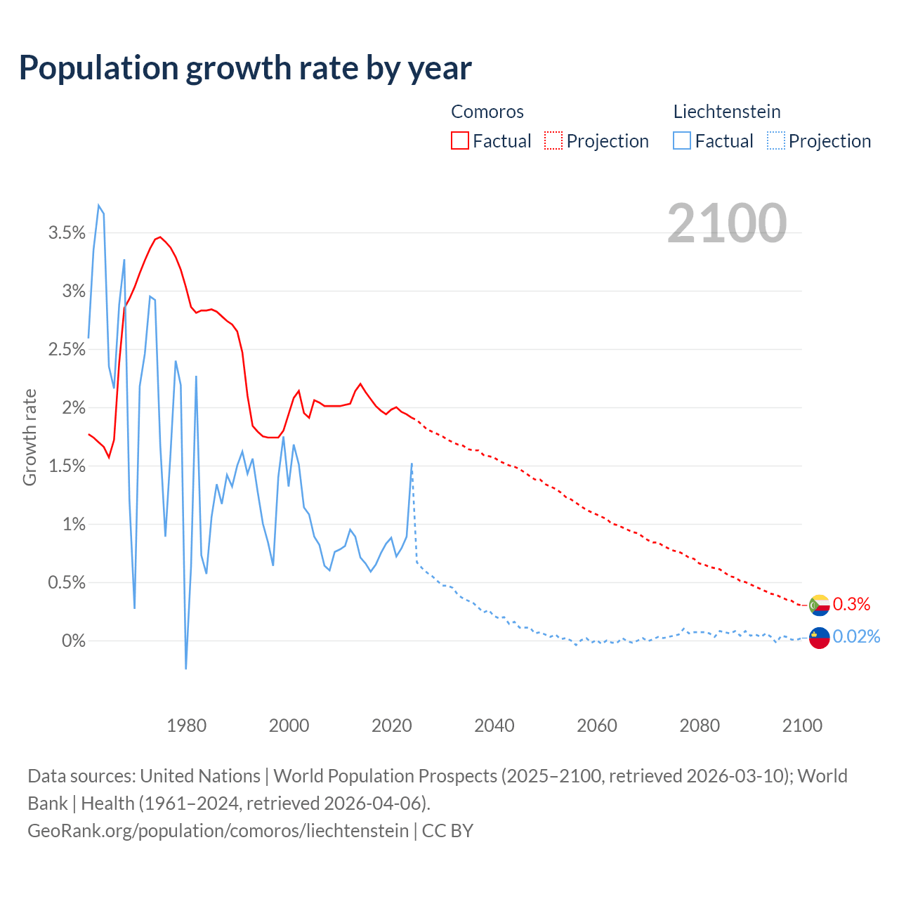 - For the last 10 years, Comoros has had an average growth rate of +2.01% per year vs +0.82% in Liechtenstein.