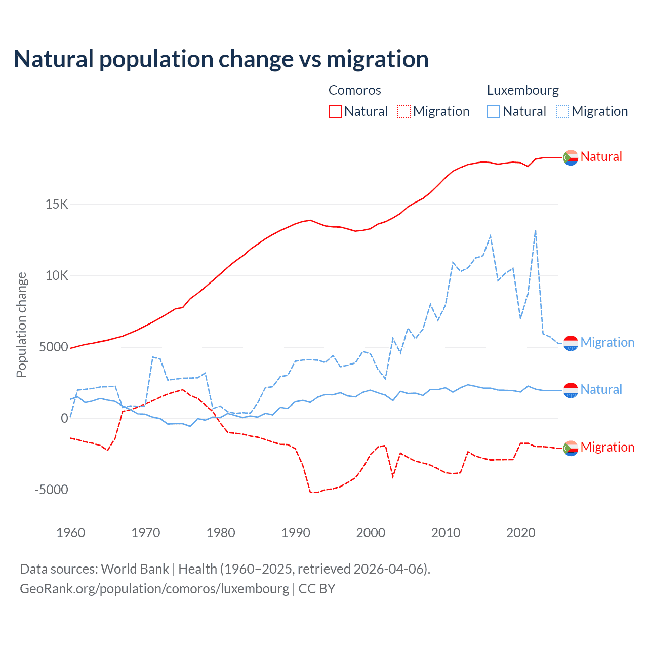 Over the last 10 years, 87.9% of the population change in Comoros is from natural causes (a gain of 179,319 people) and 12.1% is from migration (a loss of 24,709 people). In Luxembourg 16.8% is from natural causes (a gain of 20,287 people) and 83.2% is from migration (a gain of 100,435 people).