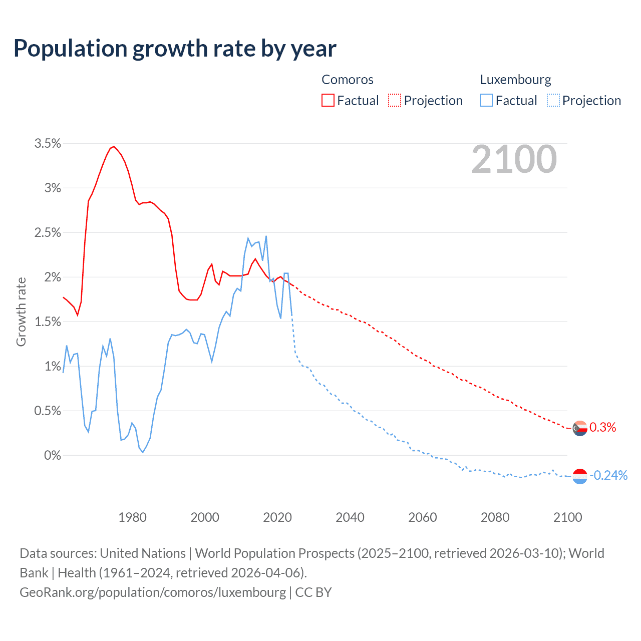 - For the last 10 years, Comoros has had an average growth rate of +2.01% per year vs +2.02% in Luxembourg.
