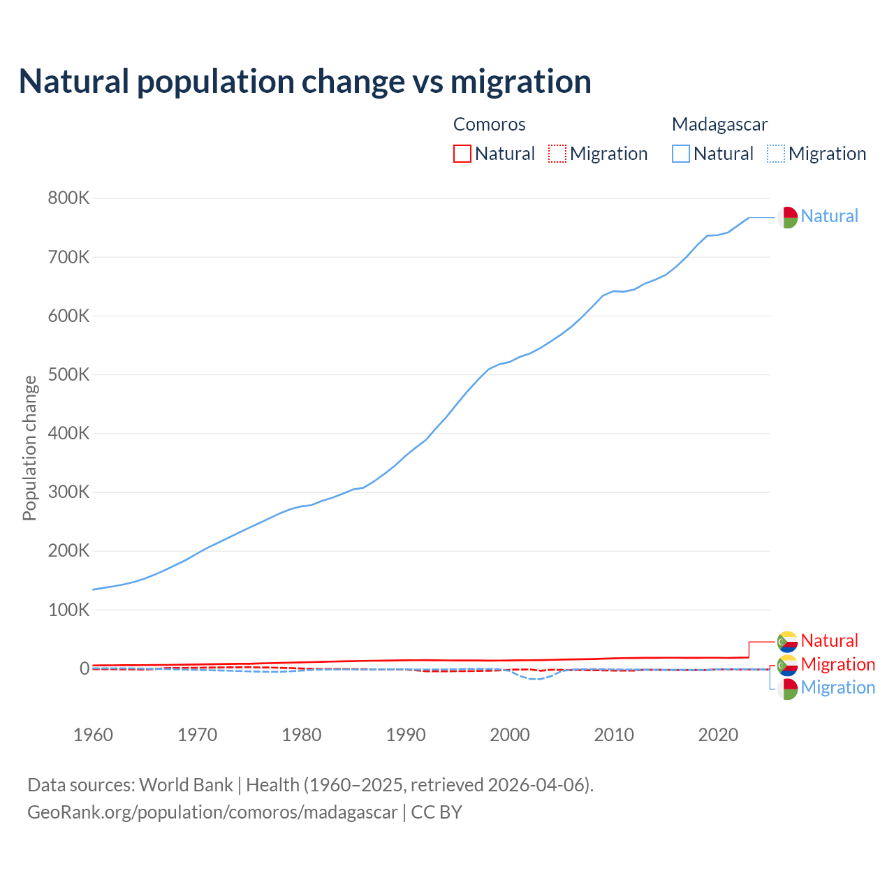 Over the last 10 years, 87.9% of the population change in Comoros is from natural causes (a gain of 179,319 people) and 12.1% is from migration (a loss of 24,709 people). In Madagascar 99.7% is from natural causes (a gain of 7,165,578 people) and 0.31% is from migration (a loss of 22,384 people).