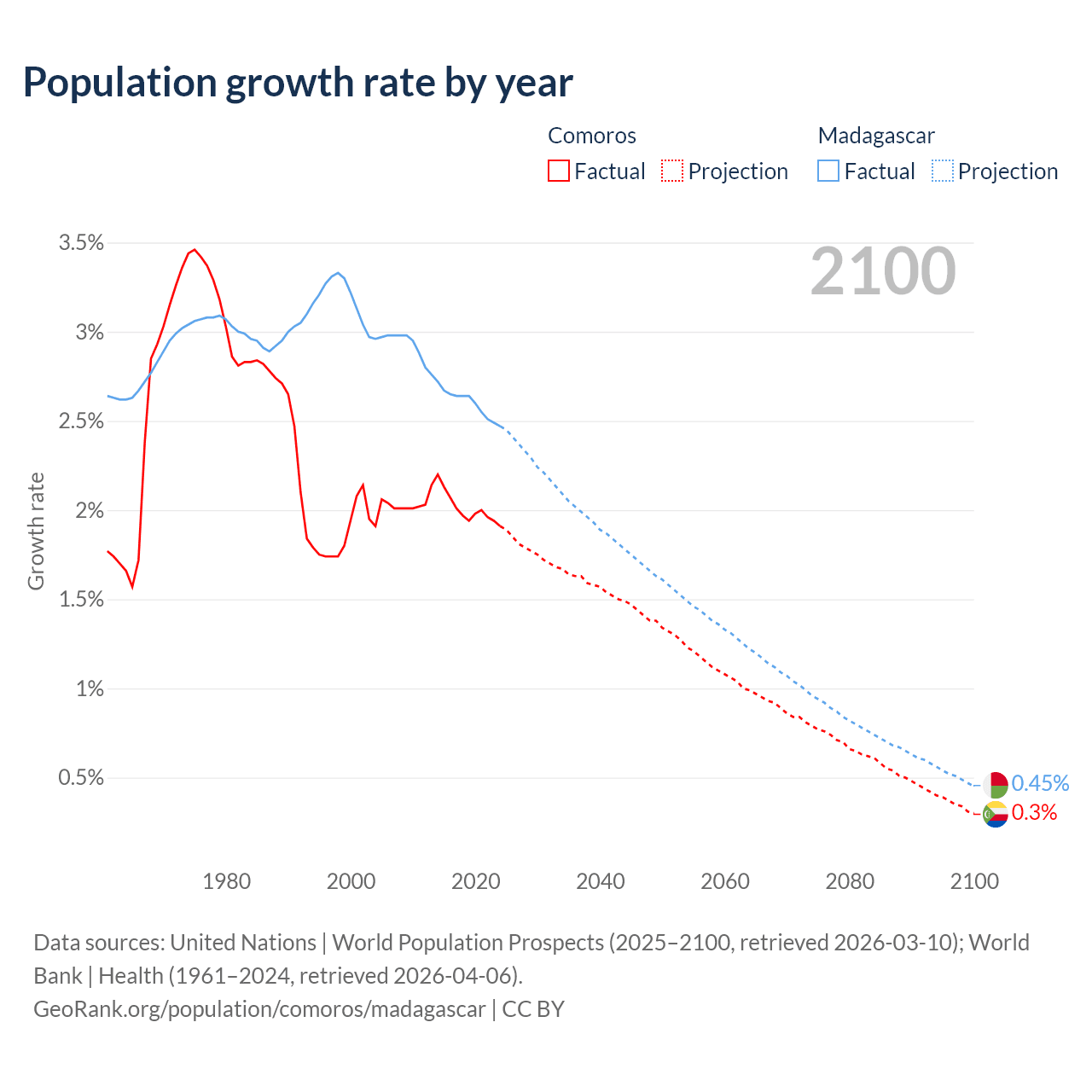 Comoros vs Madagascar: population by year and forecast