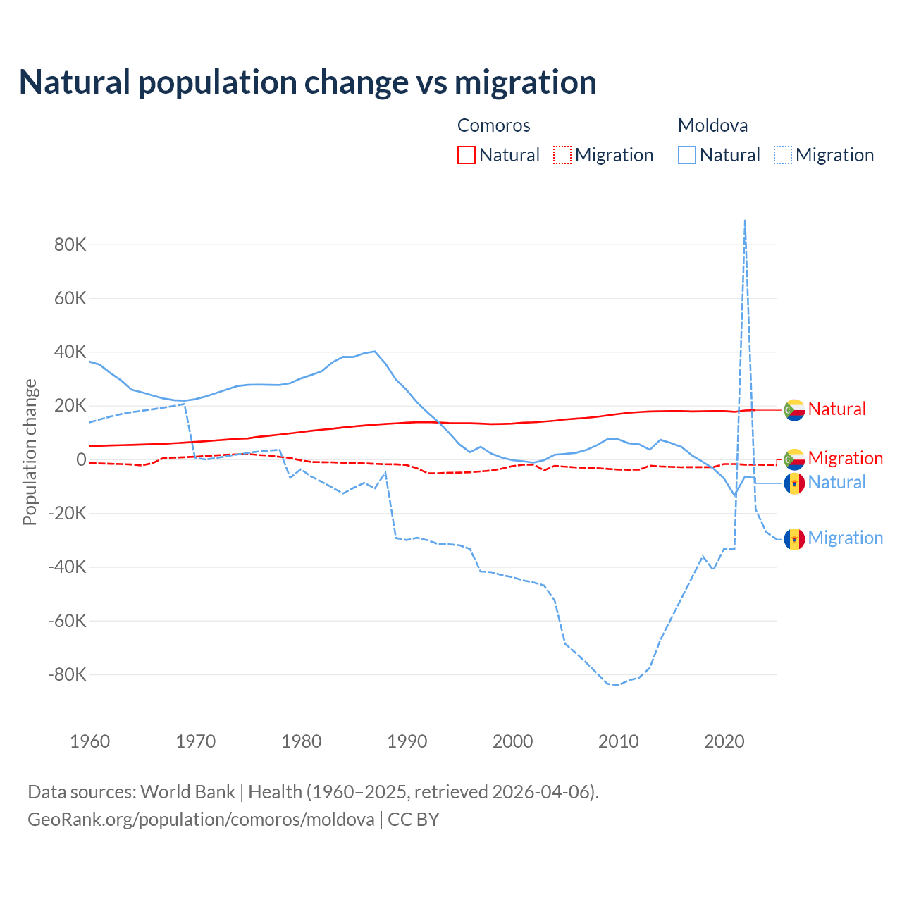 Over the last 10 years, 87.9% of the population change in Comoros is from natural causes (a gain of 179,319 people) and 12.1% is from migration (a loss of 24,709 people). In Moldova 6.04% is from natural causes (a loss of 19,001 people) and 94% is from migration (a loss of 295,631 people).