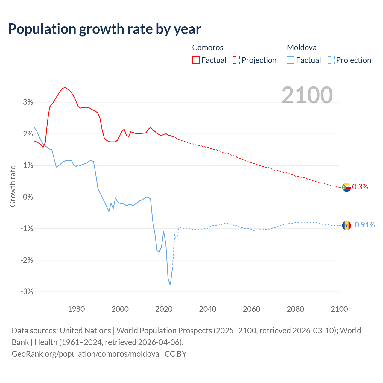 - For the last 10 years, Comoros has had an average growth rate of +2.01% per year vs -1.57% in Moldova.