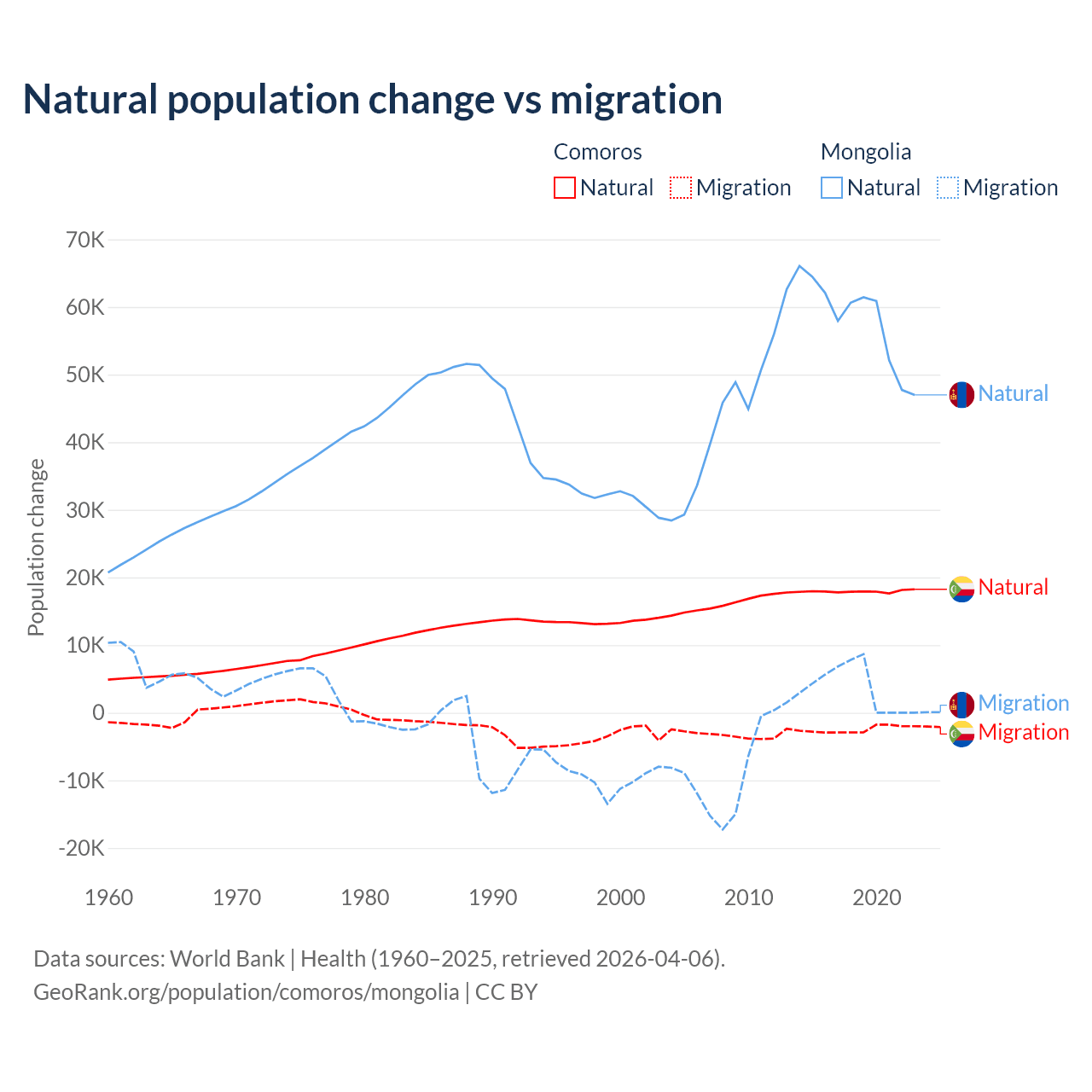 Over the last 10 years, 87.9% of the population change in Comoros is from natural causes (a gain of 179,319 people) and 12.1% is from migration (a loss of 24,709 people). In Mongolia 94.1% is from natural causes (a gain of 580,367 people) and 5.87% is from migration (a gain of 36,163 people).