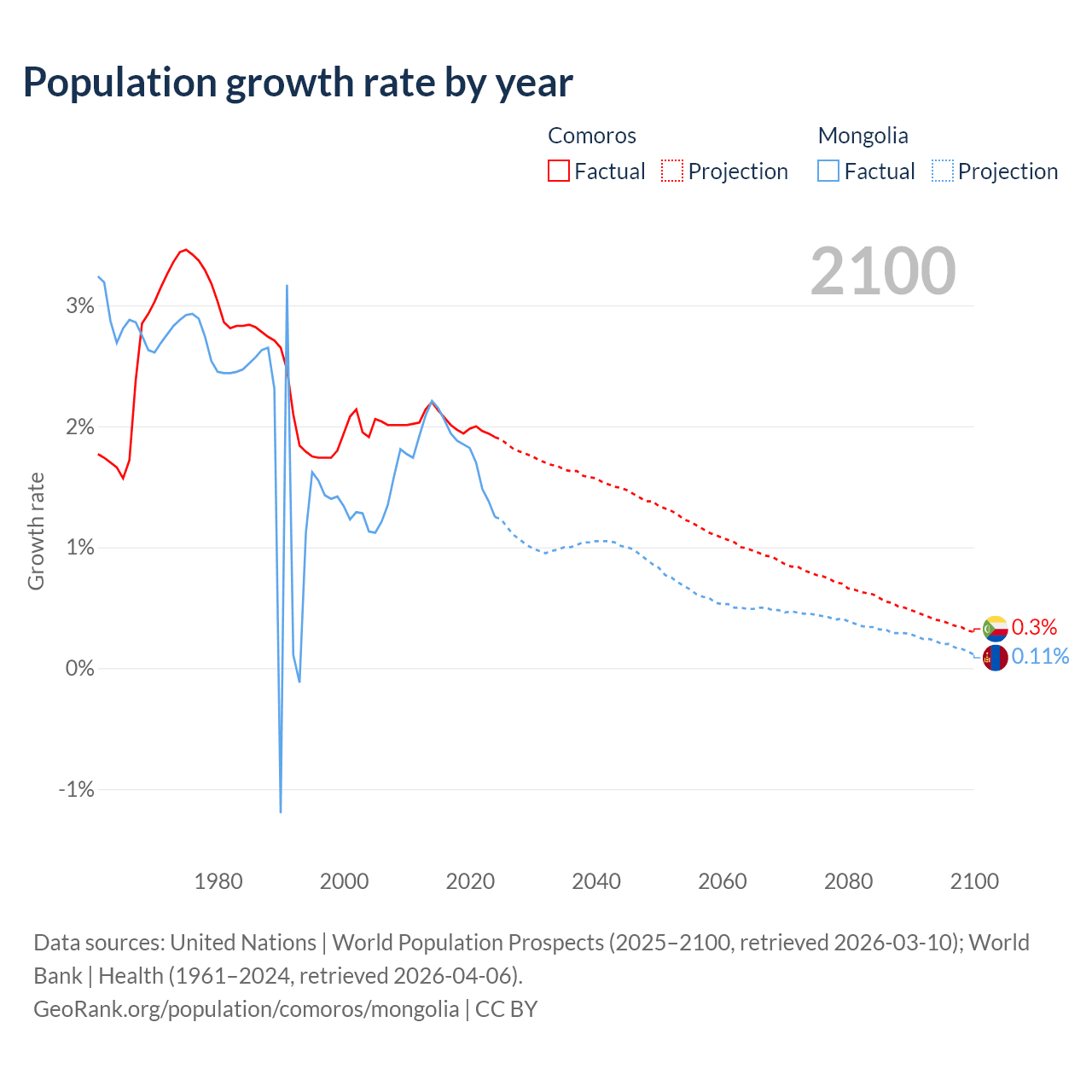 - For the last 10 years, Comoros has had an average growth rate of +2.01% per year vs +1.79% in Mongolia.