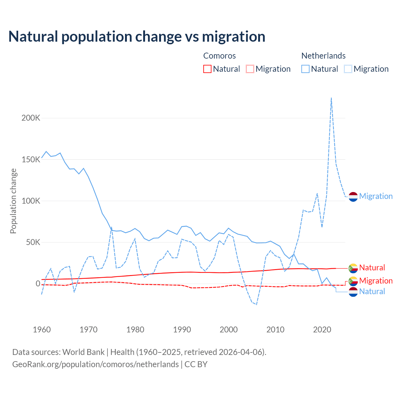 Over the last 10 years, 87.9% of the population change in Comoros is from natural causes (a gain of 179,319 people) and 12.1% is from migration (a loss of 24,709 people). In the Netherlands 11.8% is from natural causes (a gain of 134,554 people) and 88.2% is from migration (a gain of 1,006,495 people).
