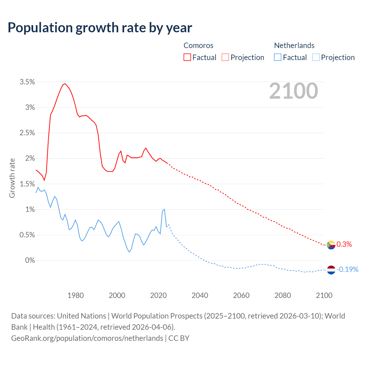 - For the last 10 years, Comoros has had an average growth rate of +2.01% per year vs +0.62% in the Netherlands.