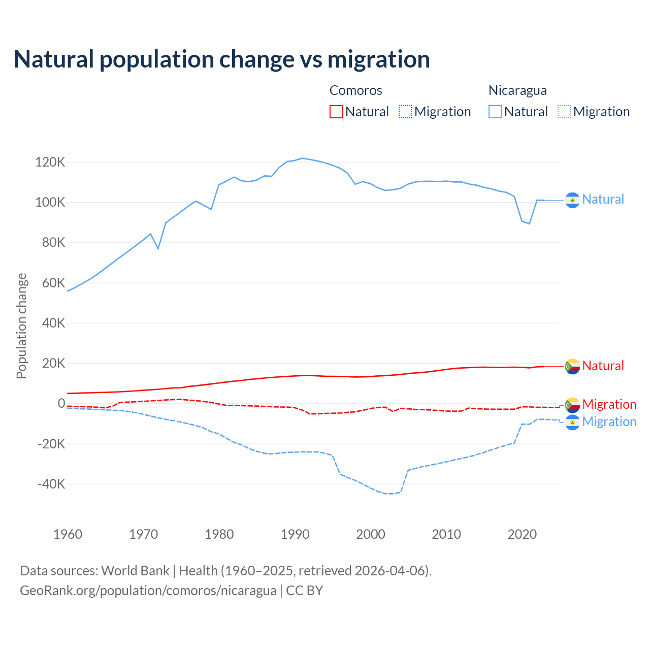 Over the last 10 years, 87.9% of the population change in Comoros is from natural causes (a gain of 179,319 people) and 12.1% is from migration (a loss of 24,709 people). In Nicaragua 85.5% is from natural causes (a gain of 1,017,084 people) and 14.5% is from migration (a loss of 172,078 people).