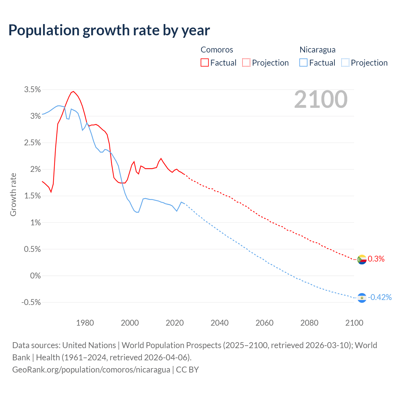 - For the last 10 years, Comoros has had an average growth rate of +2.01% per year vs +1.33% in Nicaragua.