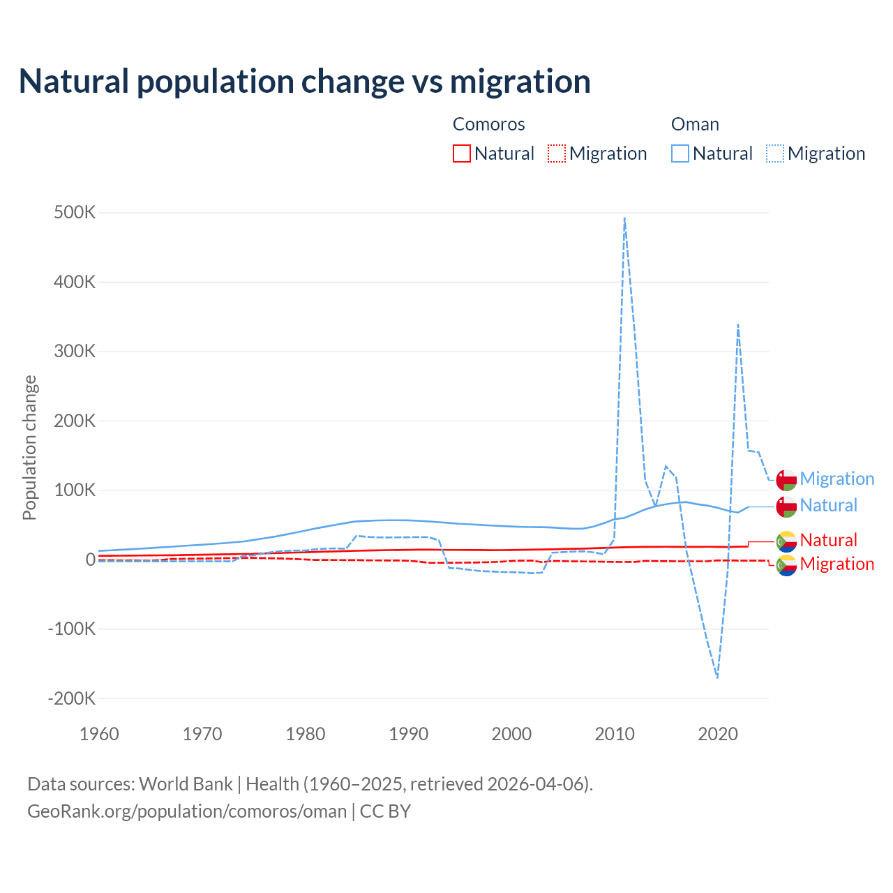 Over the last 10 years, 87.9% of the population change in Comoros is from natural causes (a gain of 179,319 people) and 12.1% is from migration (a loss of 24,709 people). In Oman 61.6% is from natural causes (a gain of 763,049 people) and 38.4% is from migration (a gain of 475,565 people).