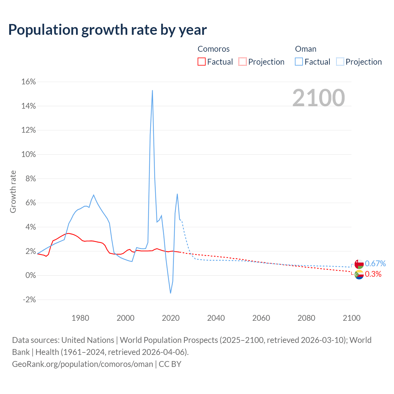 - For the last 10 years, Comoros has had an average growth rate of +2.01% per year vs +2.99% in Oman.