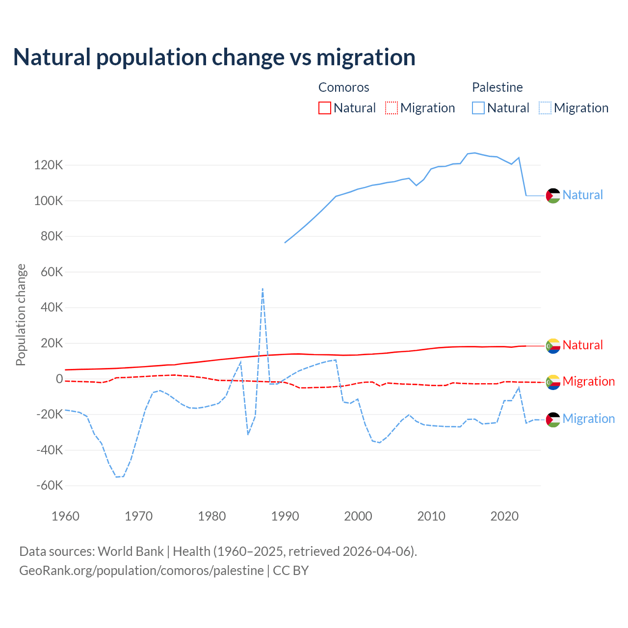 Over the last 10 years, 87.9% of the population change in Comoros is from natural causes (a gain of 179,319 people) and 12.1% is from migration (a loss of 24,709 people). In Palestine 85.7% is from natural causes (a gain of 1,218,010 people) and 14.3% is from migration (a loss of 202,820 people).
