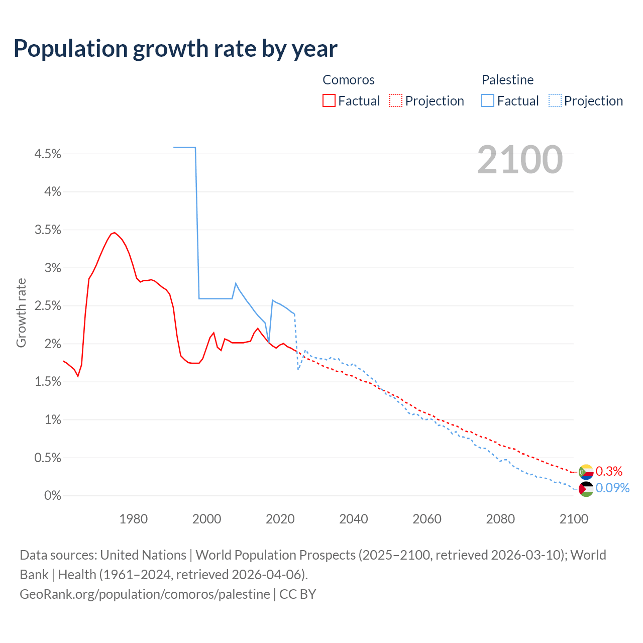 - For the last 10 years, Comoros has had an average growth rate of +2.01% per year vs +2.4% in Palestine.