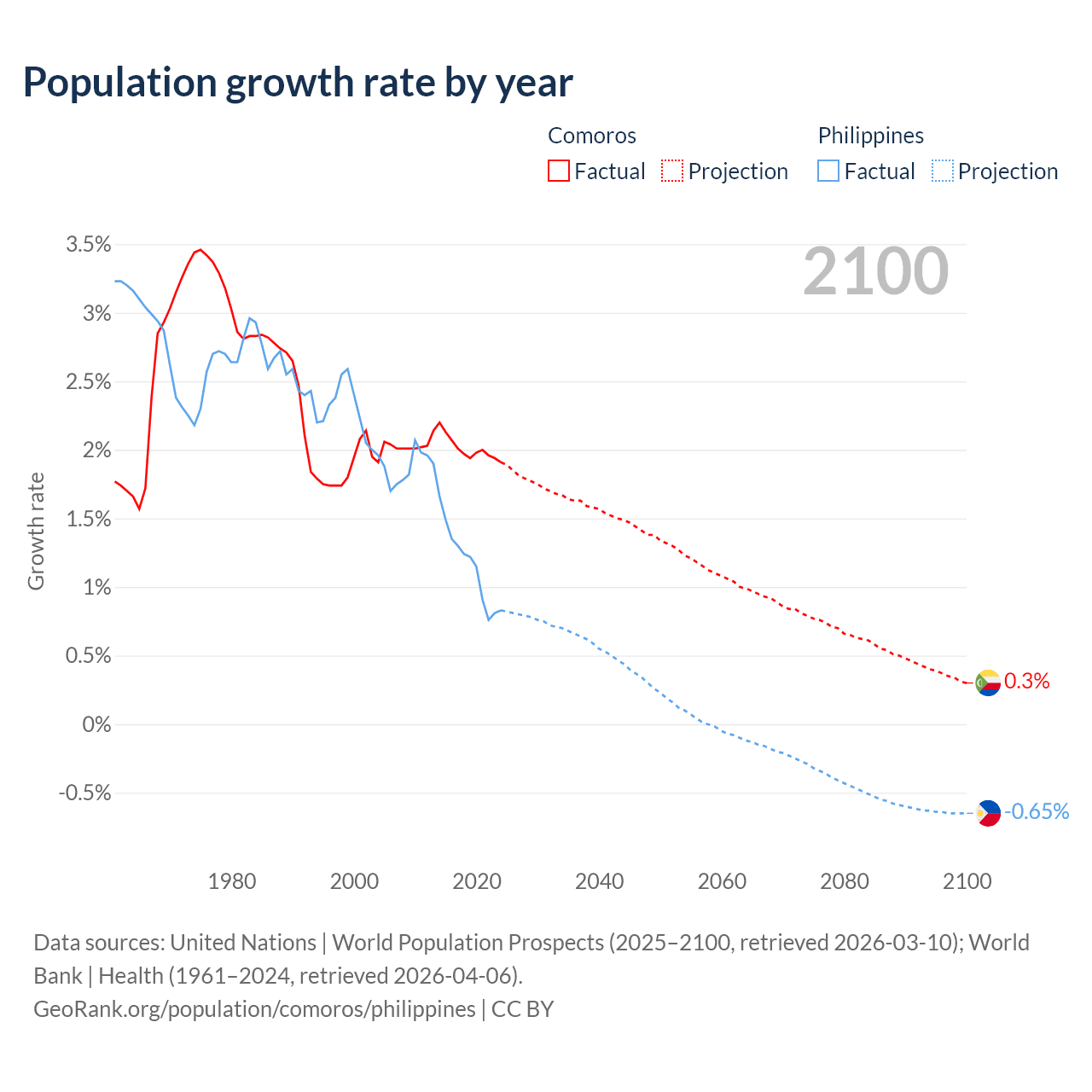 - For the last 10 years, Comoros has had an average growth rate of +2.01% per year vs +1.16% in the Philippines.