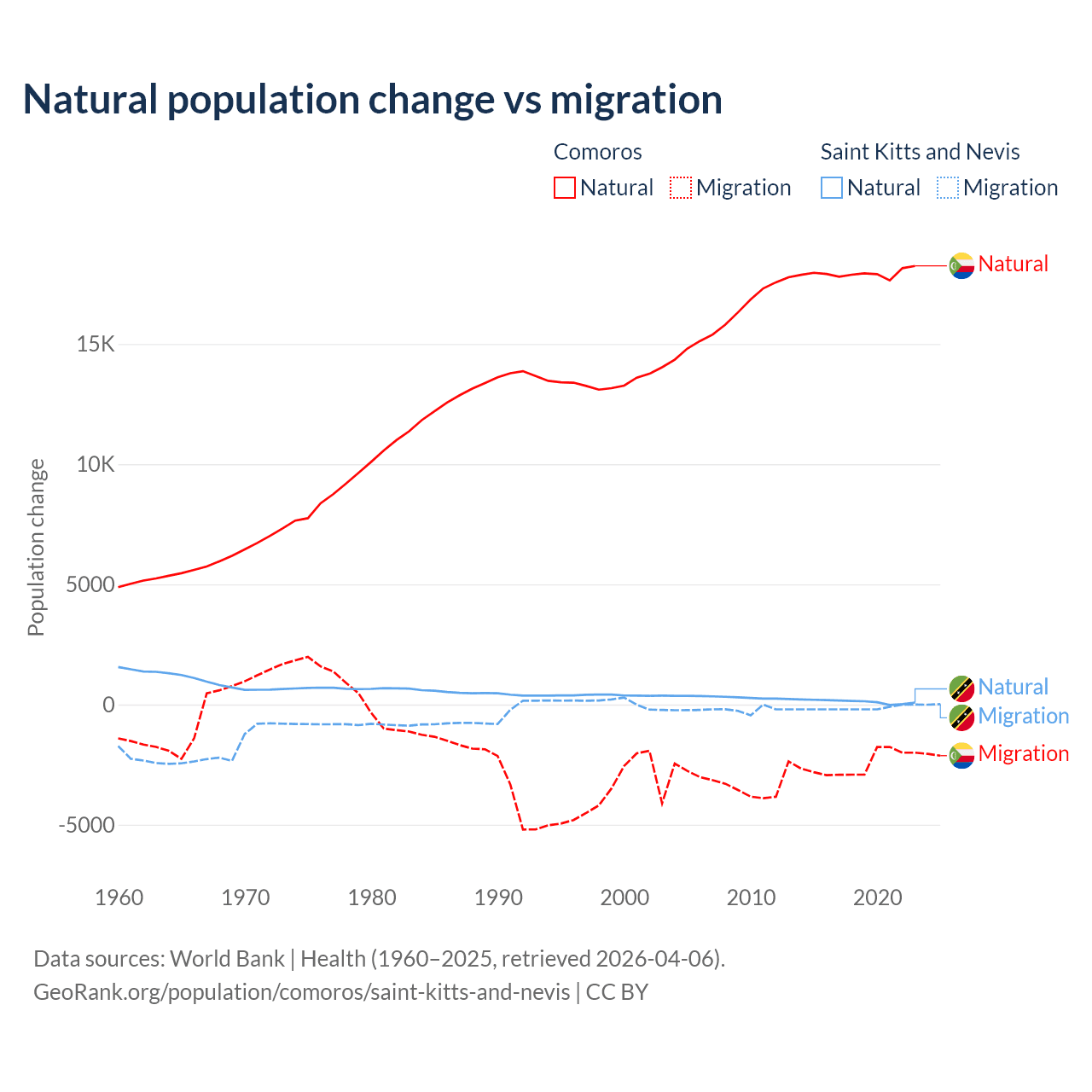 Over the last 10 years, 87.9% of the population change in Comoros is from natural causes (a gain of 179,319 people) and 12.1% is from migration (a loss of 24,709 people). In Saint Kitts and Nevis 44.9% is from natural causes (a gain of 1,225 people) and 55.1% is from migration (a loss of 1,506 people).