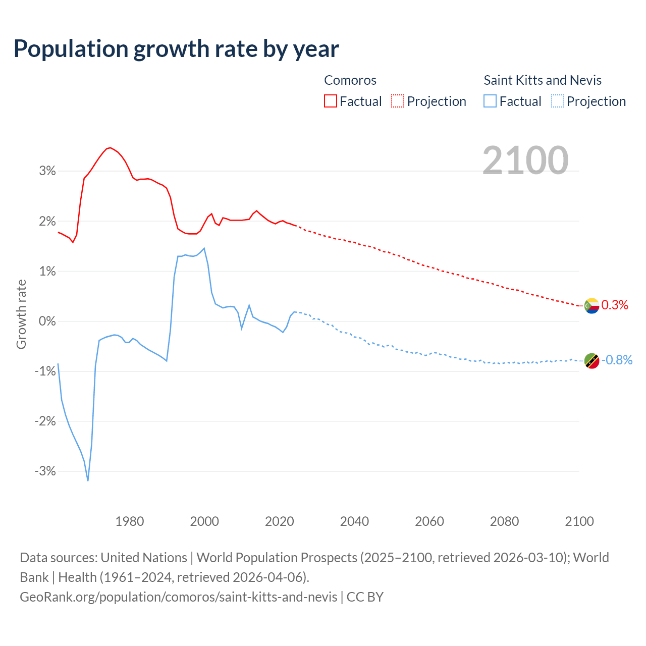 - For the last 10 years, Comoros has had an average growth rate of +2.01% per year vs -0.04% in Saint Kitts and Nevis.