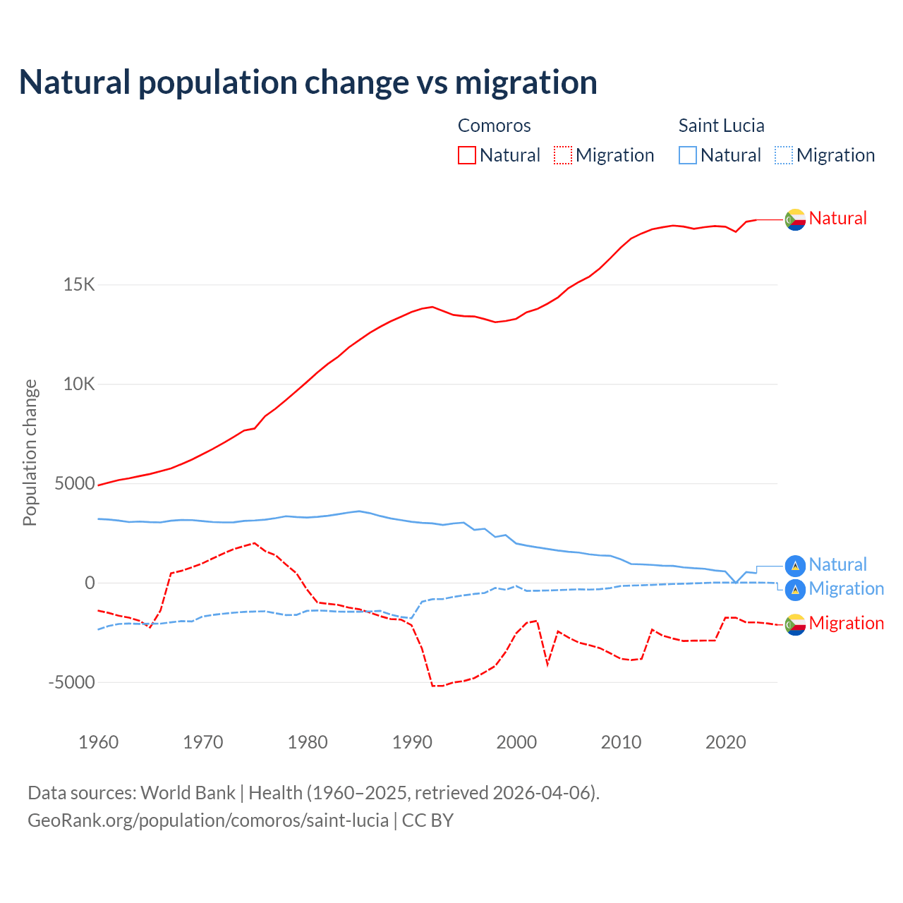 Over the last 10 years, 87.9% of the population change in Comoros is from natural causes (a gain of 179,319 people) and 12.1% is from migration (a loss of 24,709 people). In Saint Lucia 95.7% is from natural causes (a gain of 6,039 people) and 4.31% is from migration (a loss of 272 people).