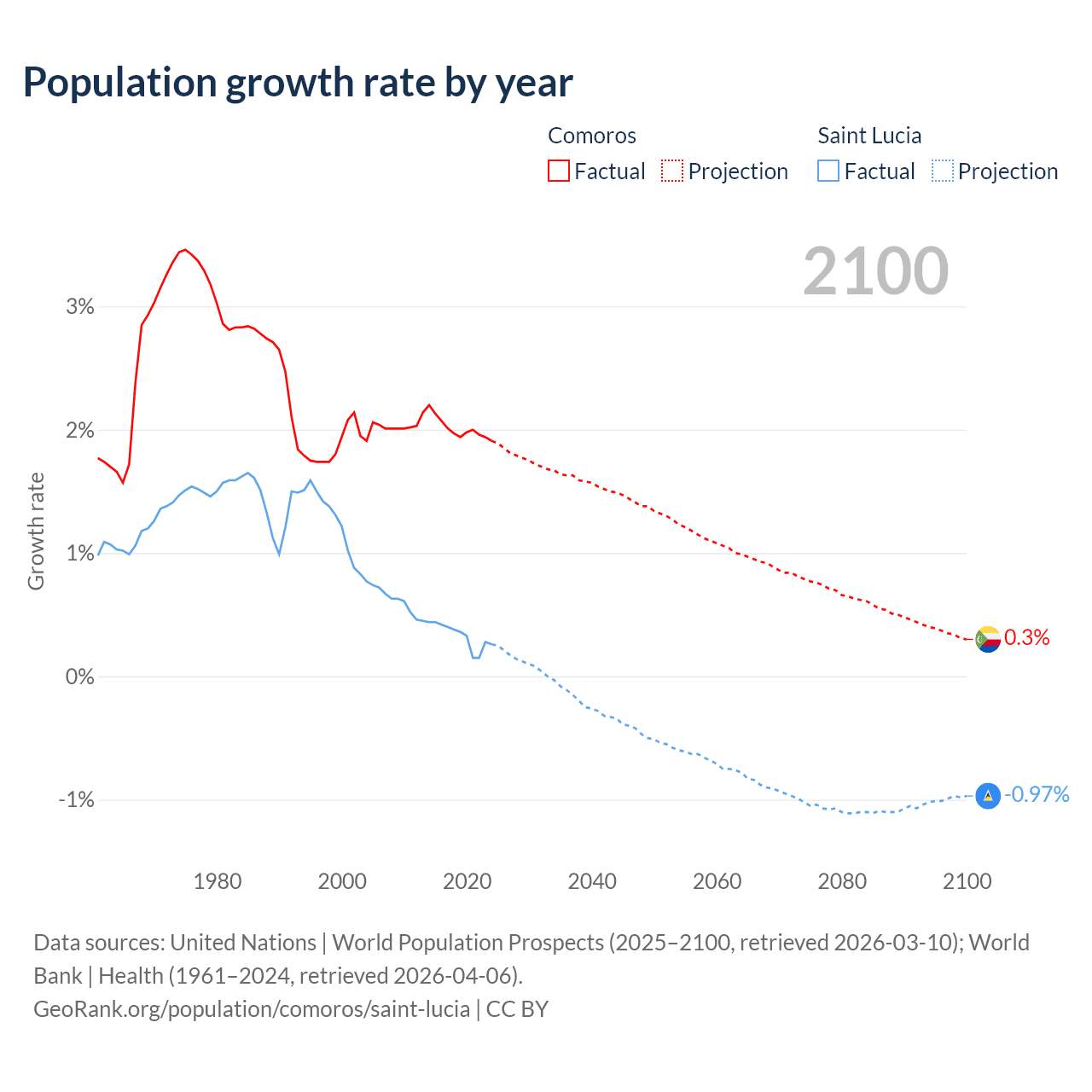 - For the last 10 years, Comoros has had an average growth rate of +2.01% per year vs +0.33% in Saint Lucia.
