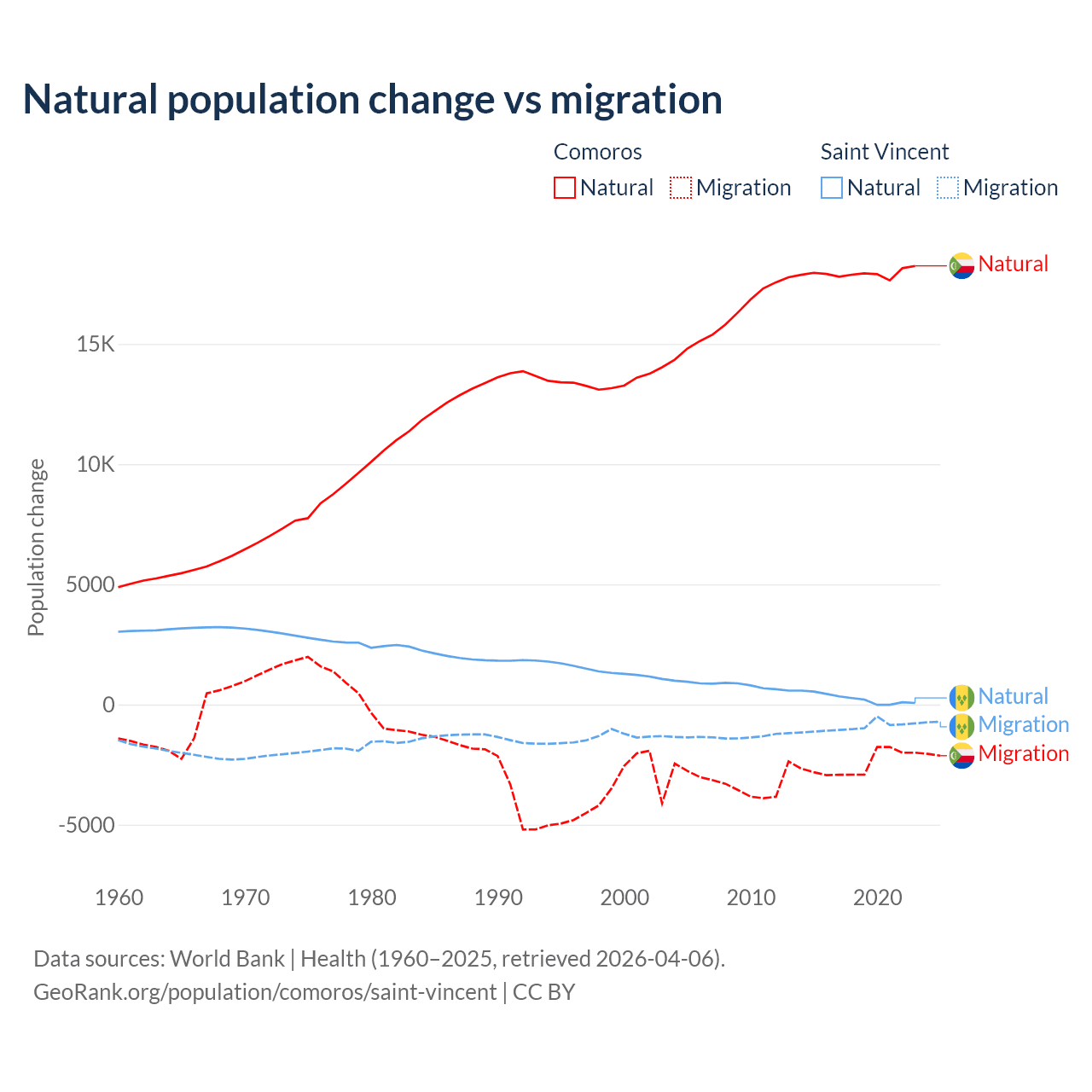 Over the last 10 years, 87.9% of the population change in Comoros is from natural causes (a gain of 179,319 people) and 12.1% is from migration (a loss of 24,709 people). In Saint Vincent 21.2% is from natural causes (a gain of 2,525 people) and 78.8% is from migration (a loss of 9,393 people).