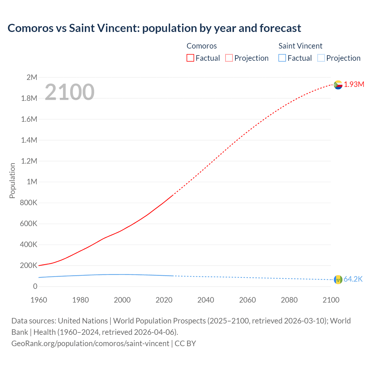 The latest officially reported population of Comoros was 866,628 in 2024 vs 100,616 people in Saint Vincent in 2024. In 2026, based on the adjusted UN estimation, the current Comoros' population is 903,776 people compared to 99,237 in Saint Vincent.
