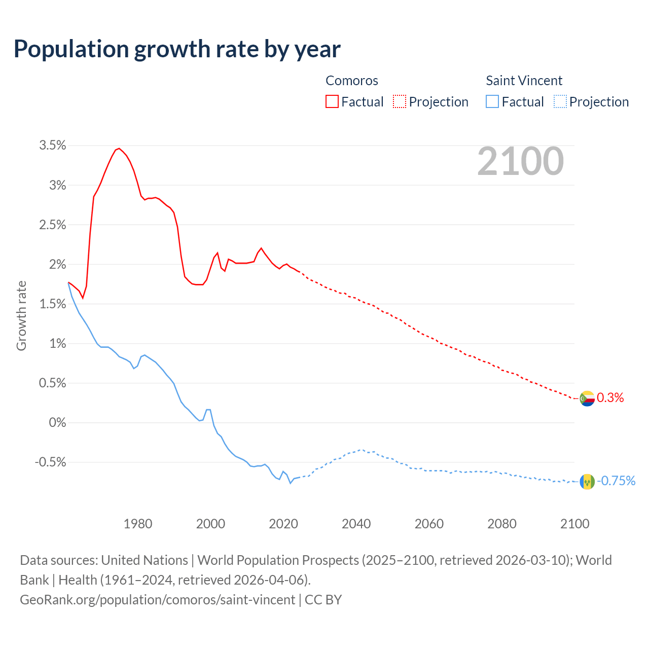 - For the last 10 years, Comoros has had an average growth rate of +2.01% per year vs -0.65% in Saint Vincent.