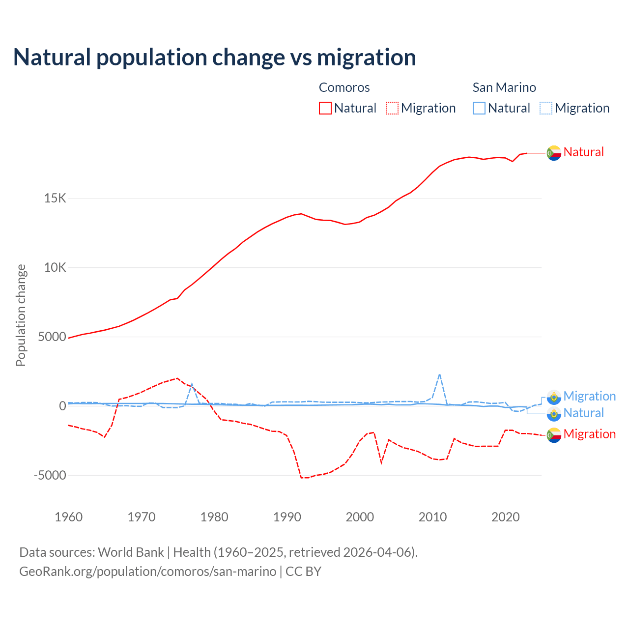 Over the last 10 years, 87.9% of the population change in Comoros is from natural causes (a gain of 179,319 people) and 12.1% is from migration (a loss of 24,709 people). In San Marino 40.9% is from natural causes (a loss of 358 people) and 59.1% is from migration (a gain of 517 people).