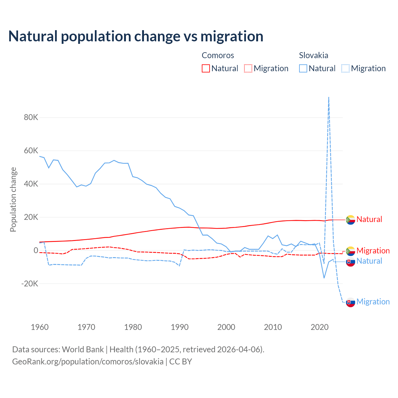 Over the last 10 years, 87.9% of the population change in Comoros is from natural causes (a gain of 179,319 people) and 12.1% is from migration (a loss of 24,709 people). In Slovakia 7.47% is from natural causes (a loss of 8,728 people) and 92.5% is from migration (a gain of 108,156 people).