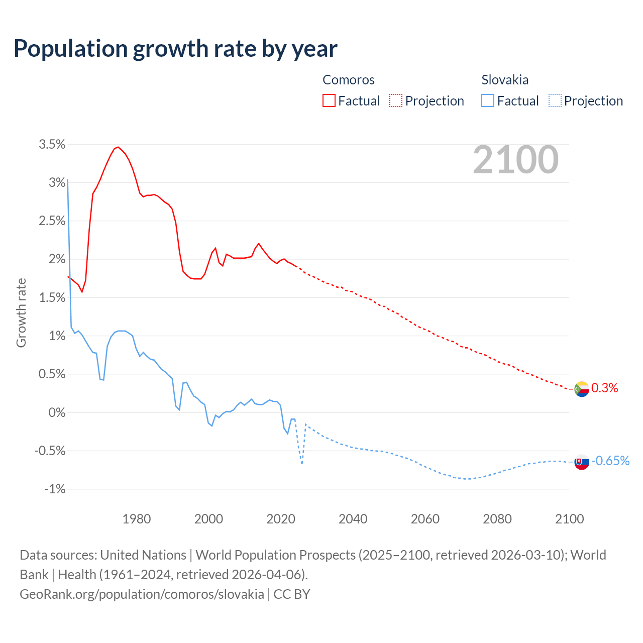 - For the last 10 years, Comoros has had an average growth rate of +2.01% per year vs +0.01% in Slovakia.