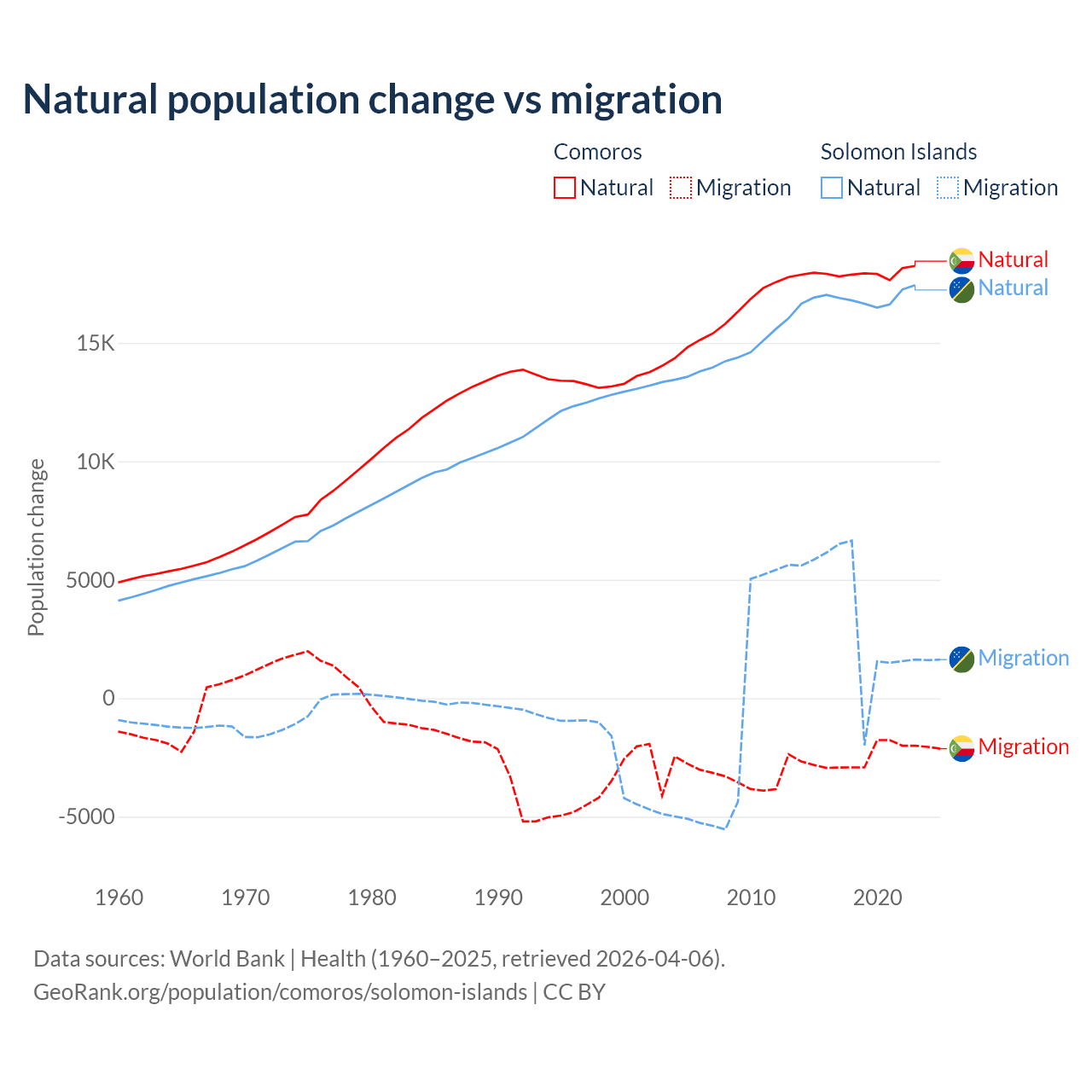 Over the last 10 years, 87.9% of the population change in Comoros is from natural causes (a gain of 179,319 people) and 12.1% is from migration (a loss of 24,709 people). In the Solomon Islands 82.8% is from natural causes (a gain of 168,727 people) and 17.2% is from migration (a gain of 35,031 people).