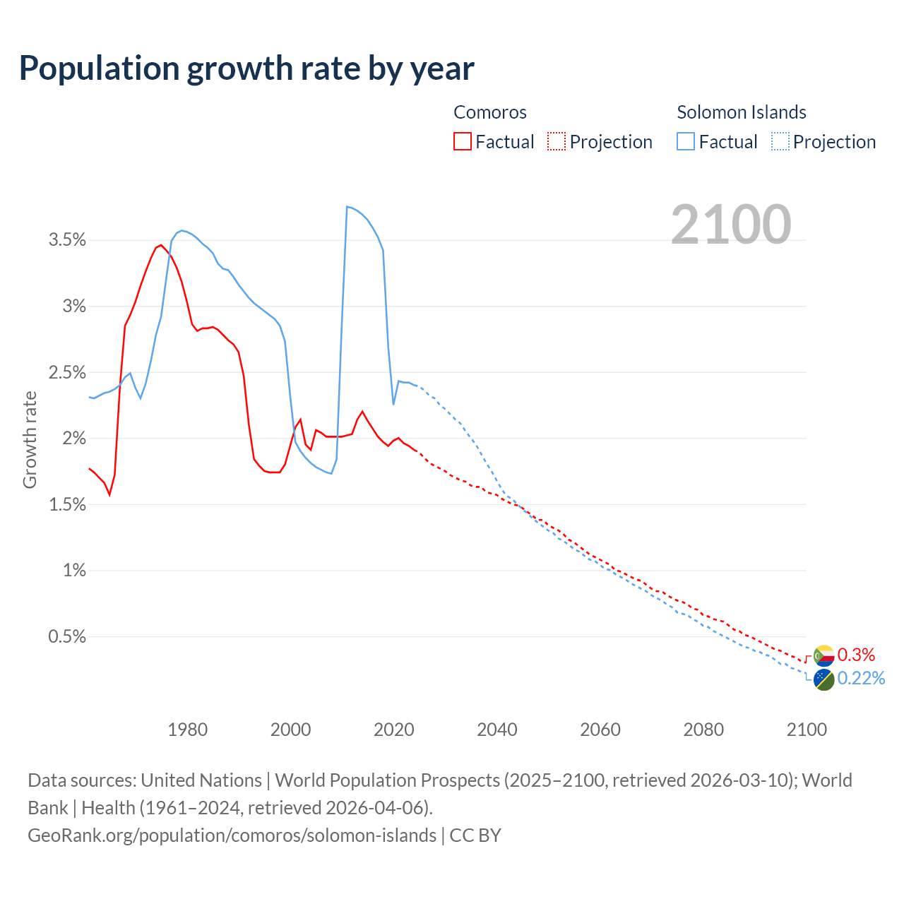 - For the last 10 years, Comoros has had an average growth rate of +2.01% per year vs +2.95% in the Solomon Islands.