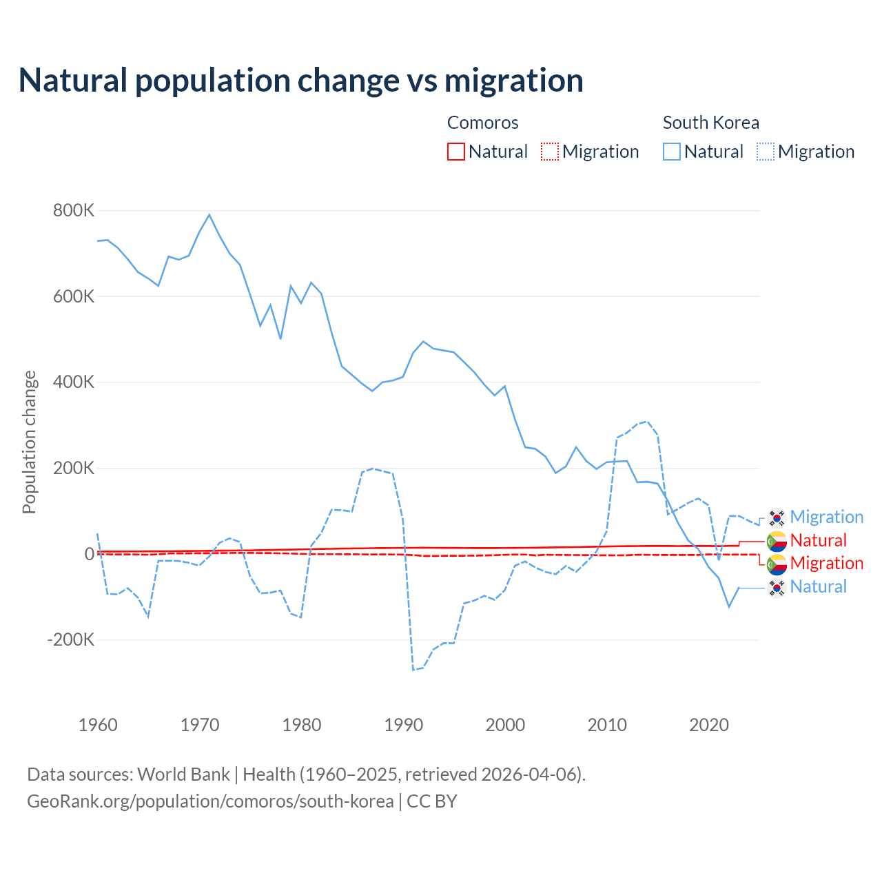 Over the last 10 years, 87.9% of the population change in Comoros is from natural causes (a gain of 179,319 people) and 12.1% is from migration (a loss of 24,709 people). In South Korea 17.6% is from natural causes (a gain of 277,215 people) and 82.4% is from migration (a gain of 1,298,356 people).