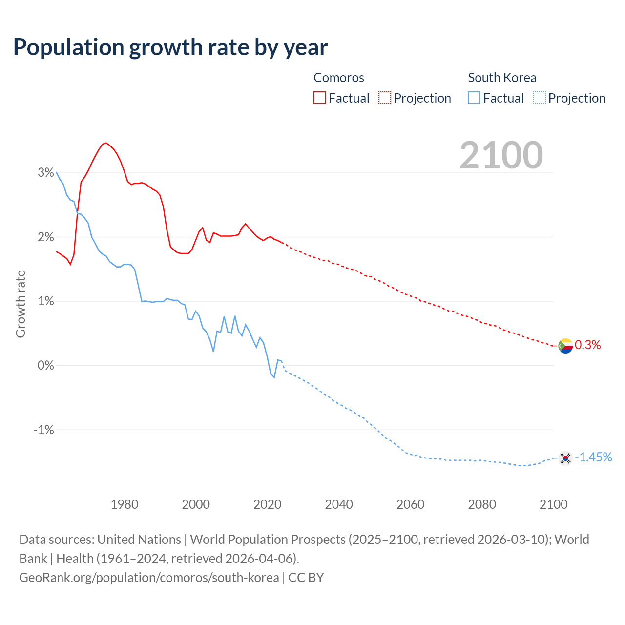 - For the last 10 years, Comoros has had an average growth rate of +2.01% per year vs +0.24% in South Korea.