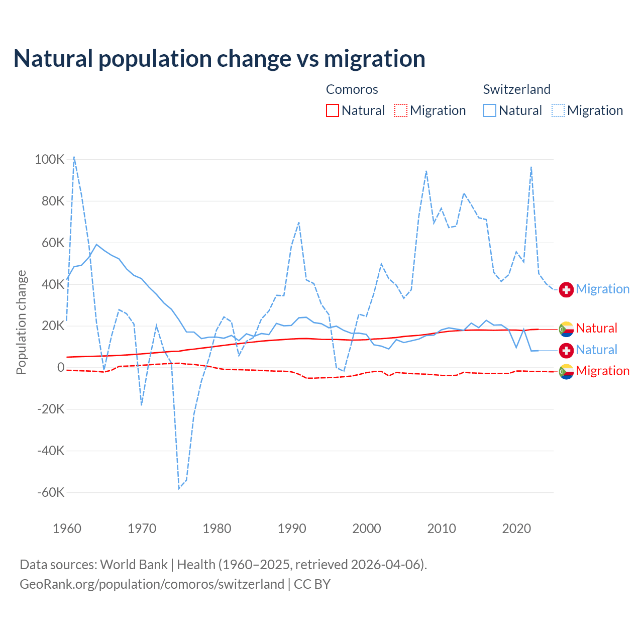 Over the last 10 years, 87.9% of the population change in Comoros is from natural causes (a gain of 179,319 people) and 12.1% is from migration (a loss of 24,709 people). In Switzerland 21.6% is from natural causes (a gain of 165,354 people) and 78.4% is from migration (a gain of 600,145 people).
