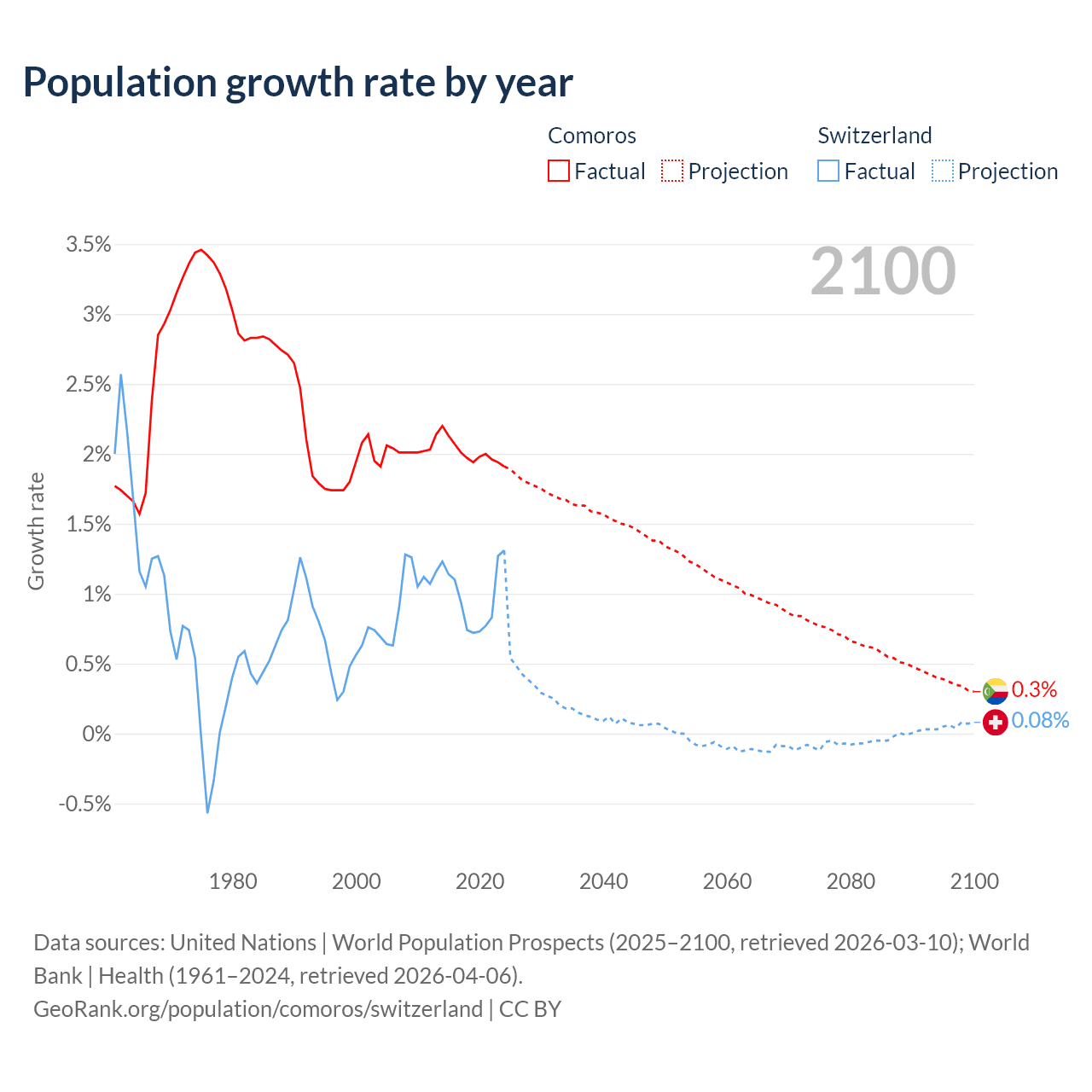 - For the last 10 years, Comoros has had an average growth rate of +2.01% per year vs +0.98% in Switzerland.