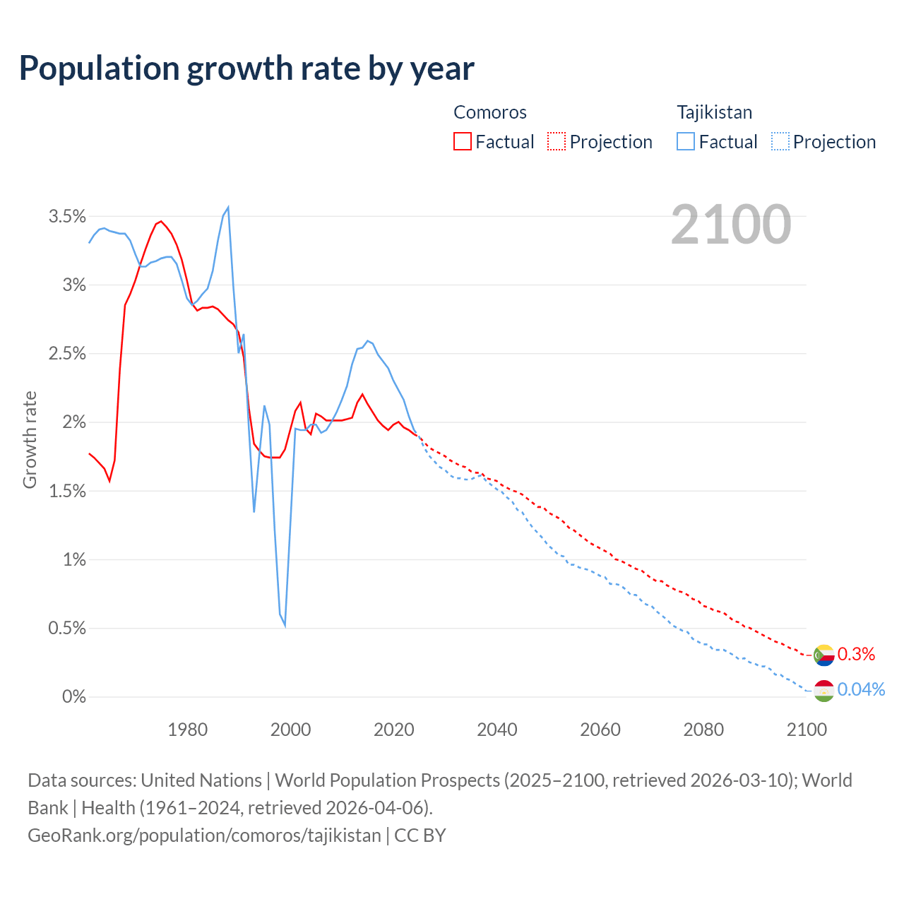- For the last 10 years, Comoros has had an average growth rate of +2.01% per year vs +2.33% in Tajikistan.