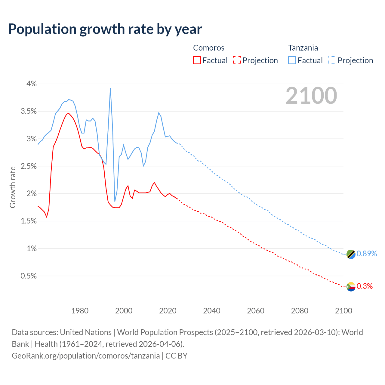 - For the last 10 years, Comoros has had an average growth rate of +2.01% per year vs +3.13% in Tanzania.